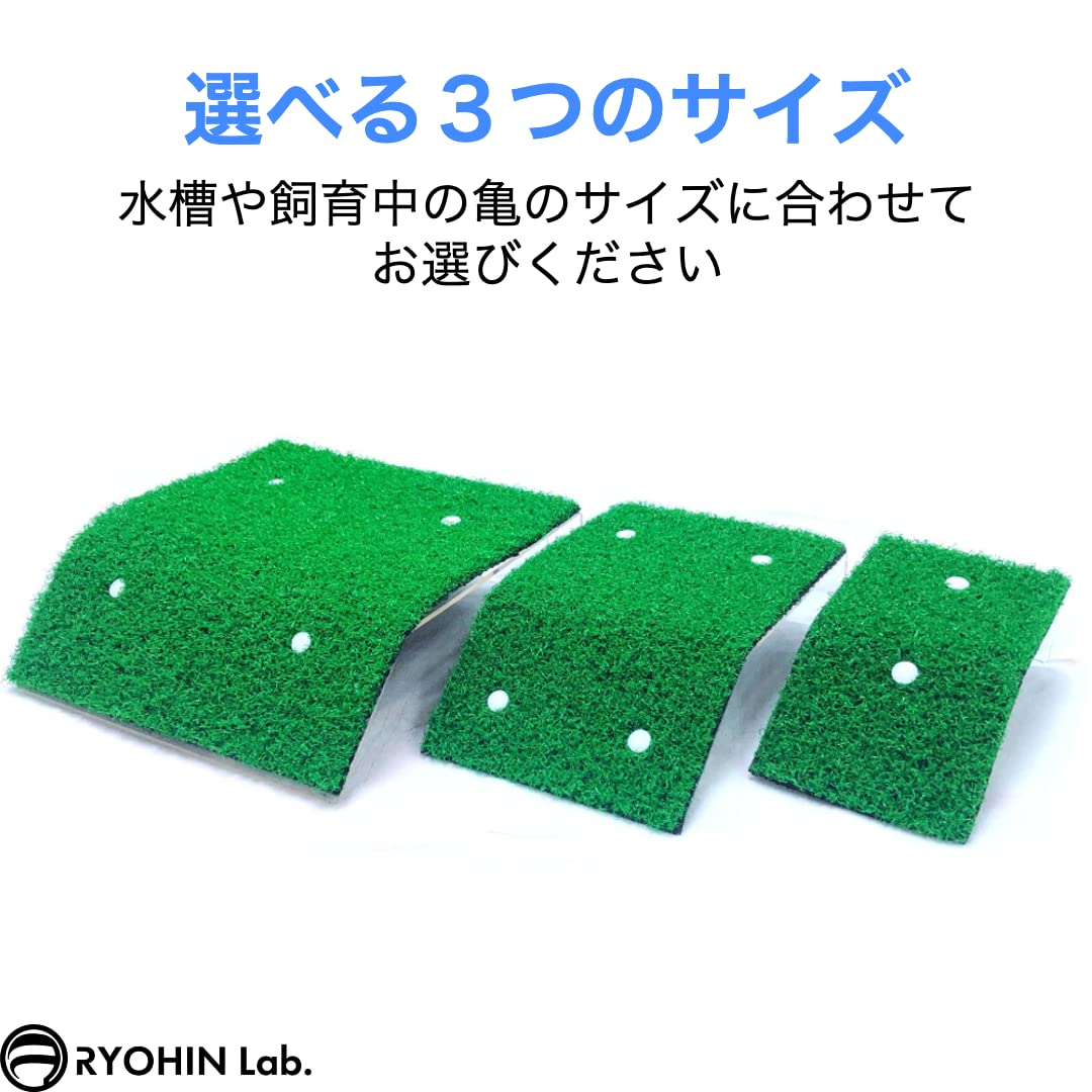 【亀が喜ぶ日向ぼっこ台】水が好きだけど陸地も大好きな亀たちに休憩の場所と日なたぼっこの場所を準備してあげられる便利なアイテムです。気持ち良く甲羅干をさせてあげられることができます。【高品質な人工芝を採用】日なたぼっこ台の表面に綺麗でナチュラルな人工芝が備わっています。亀の水槽をよりナチュラルに彩ってくれてとてもオシャレです。足がかりが良いため亀にとっても滑りにくく、登りやすいスロープ仕様です。※初めは芝が落ちやすい場合がありますので、余分な芝をよく払ってからのご使用をおすすめします。【吸盤による安定した固定】二つの吸盤で水槽にしっかり固定することができます。水槽の中で亀が動いても外れにくく、取り付けも簡単です。安定した台の上でゆったりくつろぐ亀の様子を観察できるので、亀の飼育がもっと楽しくなります。【商品内容】サイズ:[小サイズ][中サイズ][大サイズ]各サイズの寸法は画像をご覧下さい。素材:プラスチック、人工芝 個数:1個 ※モニターの環境により、色の見え方に若干差が生じる場合があります。