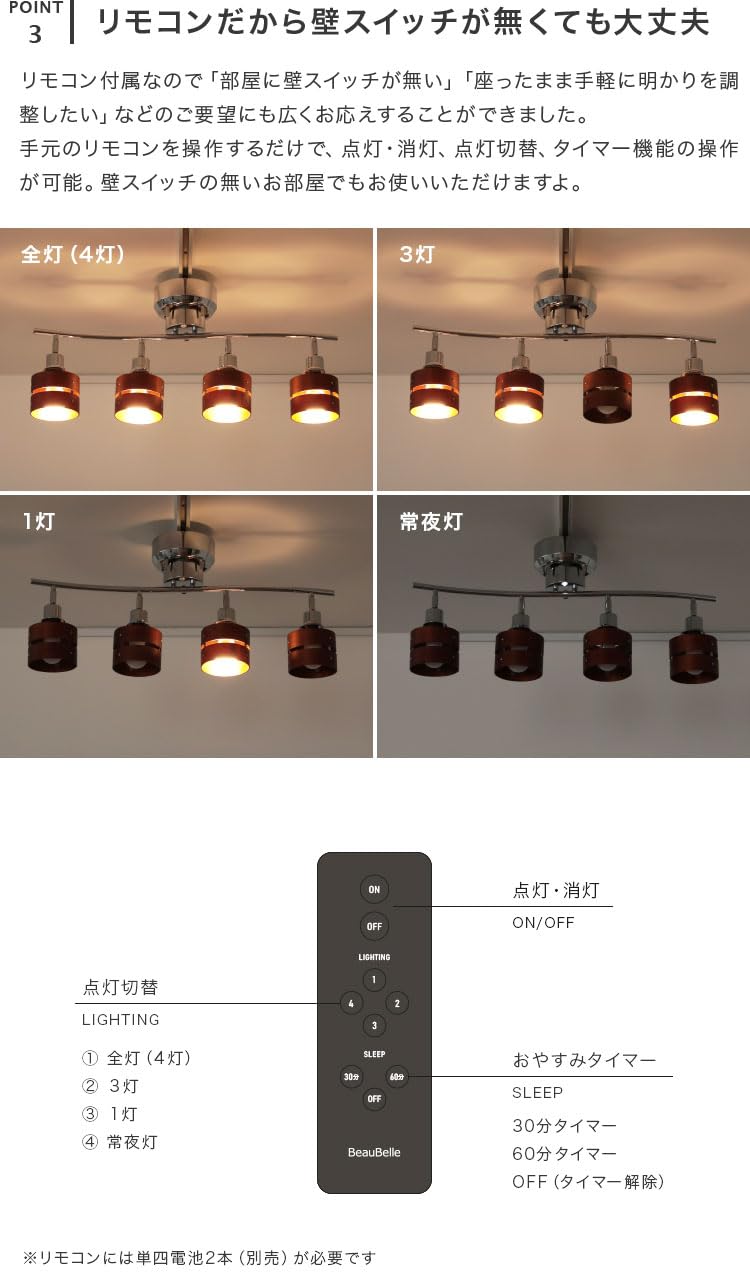 NISSHO BELLED リモコン付き シーリングライト 4灯 リモコンレダ 天井照明 おしゃれ 照明器具 照明 天井 北欧 リビング ダイニング ブラック・ブラウン BBS-114(BB)