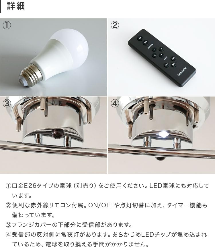 仕様\口金/E26 60W×4まで対応(電球別売)リモコン付属(単四電池×2本別売) 変更情報2020年9月3日 :シェード部分を取り外し式に変更2022年4月22日:リモコンのデザインを変更。タイマー機能追加。受信部デザイン・位置の変更。