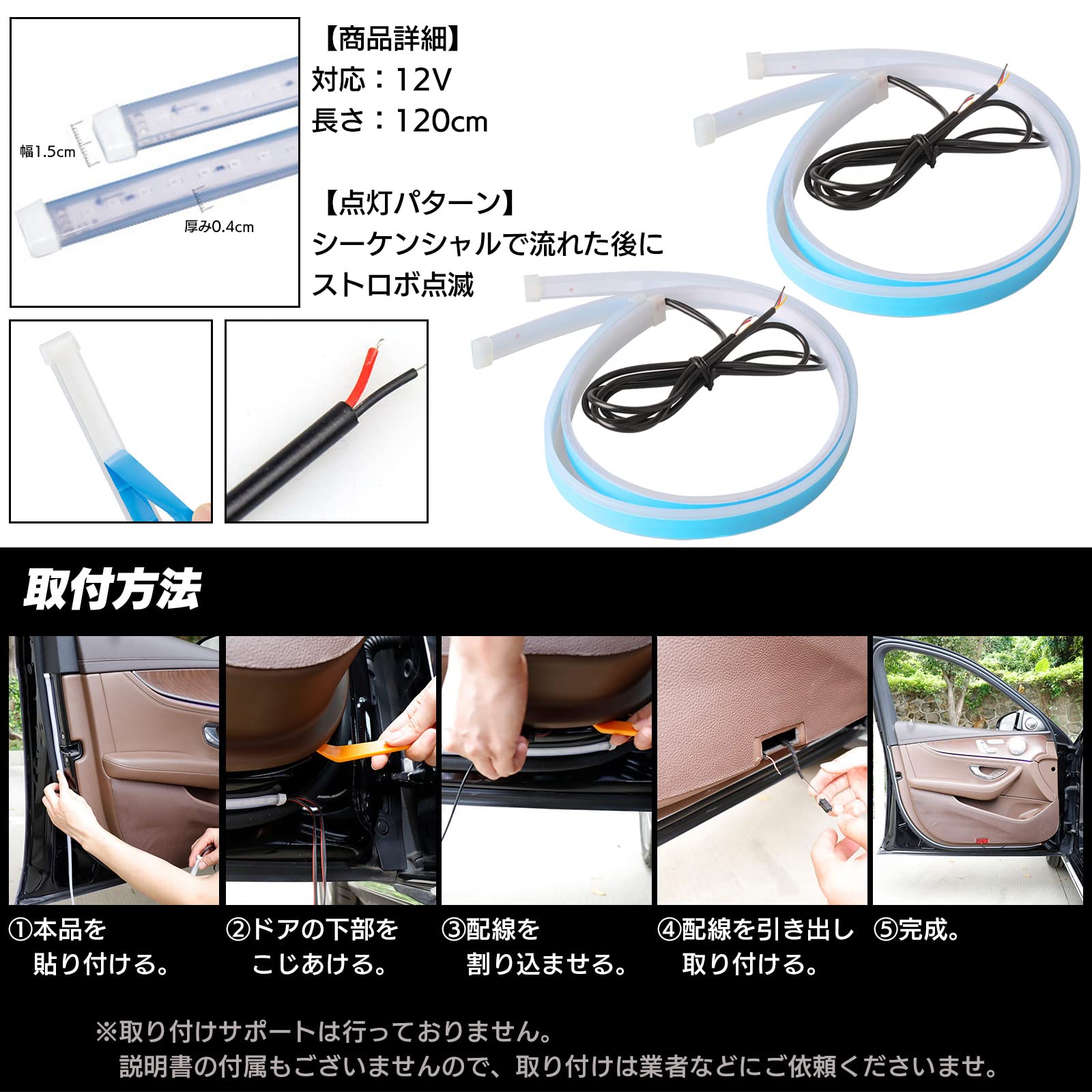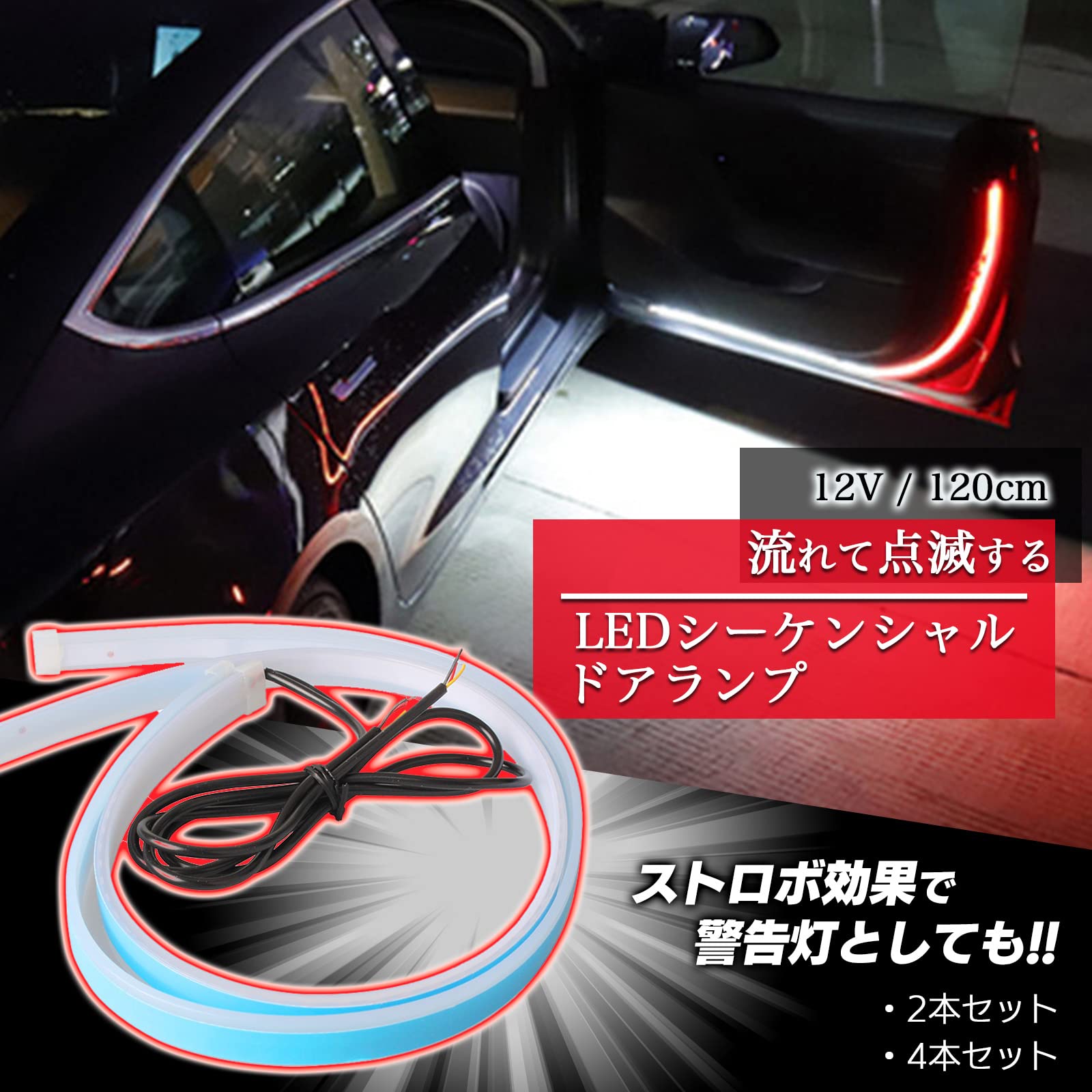 【仕様について】 電圧 : DC12V 長さ : 120cm LED : 3528/2835 SMD カラー : 赤×白(シーケンシャル×ストロボ) セット数 : 2本or4本 ※2本は運転席と助手席、4本で後部座席にもいかがでしょうか。 お友達とお揃いでも喜ばれるかと思います。 材質 : シリコン その他 : 低消費電力で省エネ、防水性能、 両面テープ付き ※LEDテープはカットしてご使用いただけます。