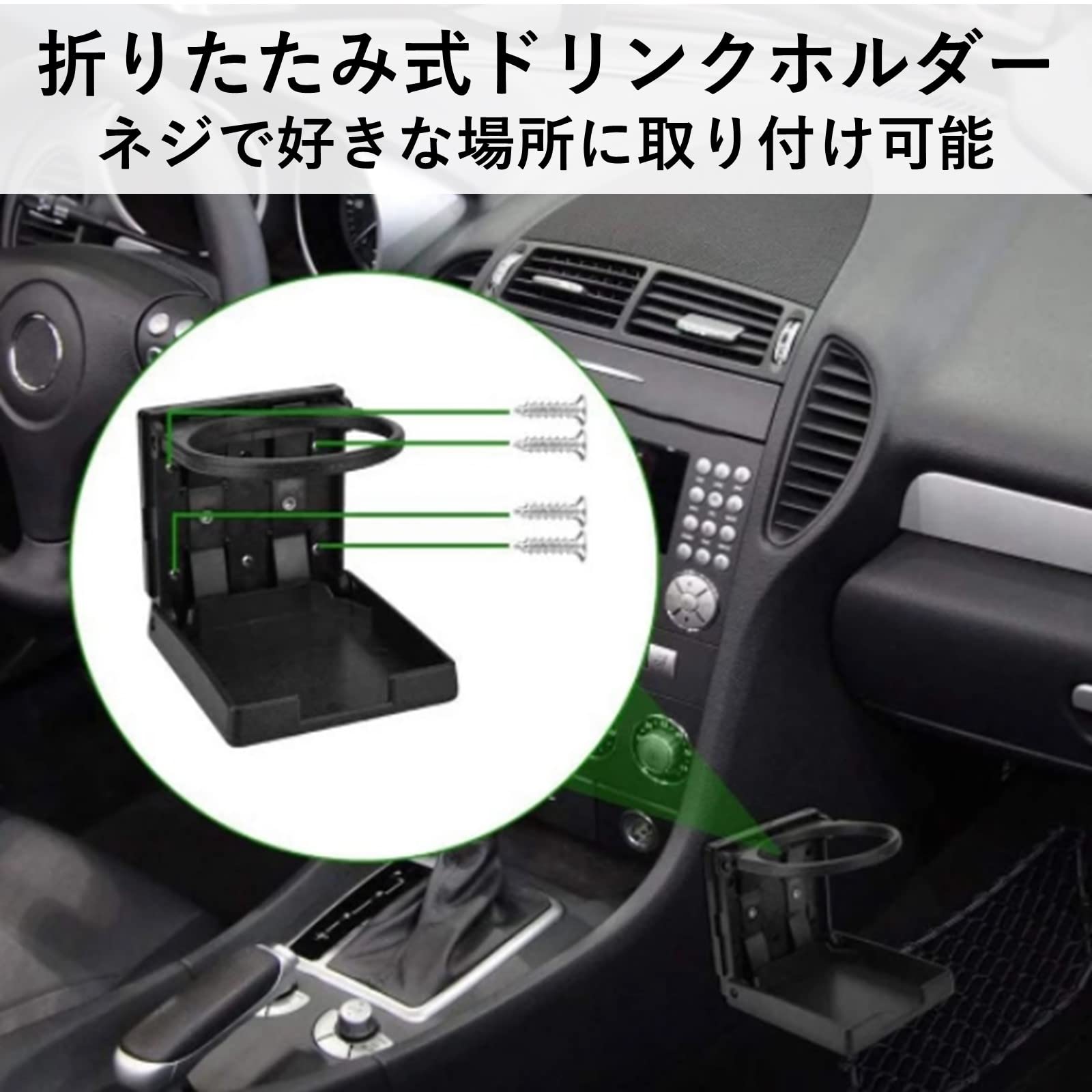 ・【折りたたみ式だから邪魔にならない】車やトラック、船やボートなどに使える、折りたたみ可能なドリンクホルダー2個セットです。使わない時は極小型のかたちに折り畳めるので、スペースを節約できます。閉じたときの厚さは僅か28mm、開いたときは108mm。省スペース設計ですので狭い場所に設置しても邪魔になりません。<br>・【耐久性のある素材】折りたたみカップホルダーは耐久性のあるABS製の厚いプラスチック製で、重さのあるボトルでも落下することなくしっかりと掴むのに十分な強度があります。底面にはクッション素材を付けており、走行中のカタつきを抑えます。プラスチック構造は完全に防水性で、お手入れが簡単です。<br>・【両面テープ&ネジで取付け簡単】調整可能な折りたたみ式ドリンクホルダーには、取り付け用のネジが付いており、取り付けと使用が簡単です。こちらは同じボトルホルダーの2個セットですので、ドアアームレストなら運転手側と助手席側の両方に設置することができます。後部座席のドアアームレストに設置して、ホルダーを使用することもできます。<br>・【ドリンクをしっかり保持】強度のあるプラスチック製で、ネジを固定するため外れることはなく、重い瓶なども置くことができます。ホルダーは最大直径75mmまで対応しており、ほとんどのカップや缶、水筒などのドリンクカップをしっかり保持することができます。<br>・【幅広い用途】カップホルダーは平らな垂直面に取り付けられます。バン、トラック、ボート、自動車、船舶、RVなどに多く使用されており、ソファの横の壁、ベッドの横、または自宅、車、スポーツセンターのどこにでも設置でき、通勤や旅行の日常生活での利便性が向上します。