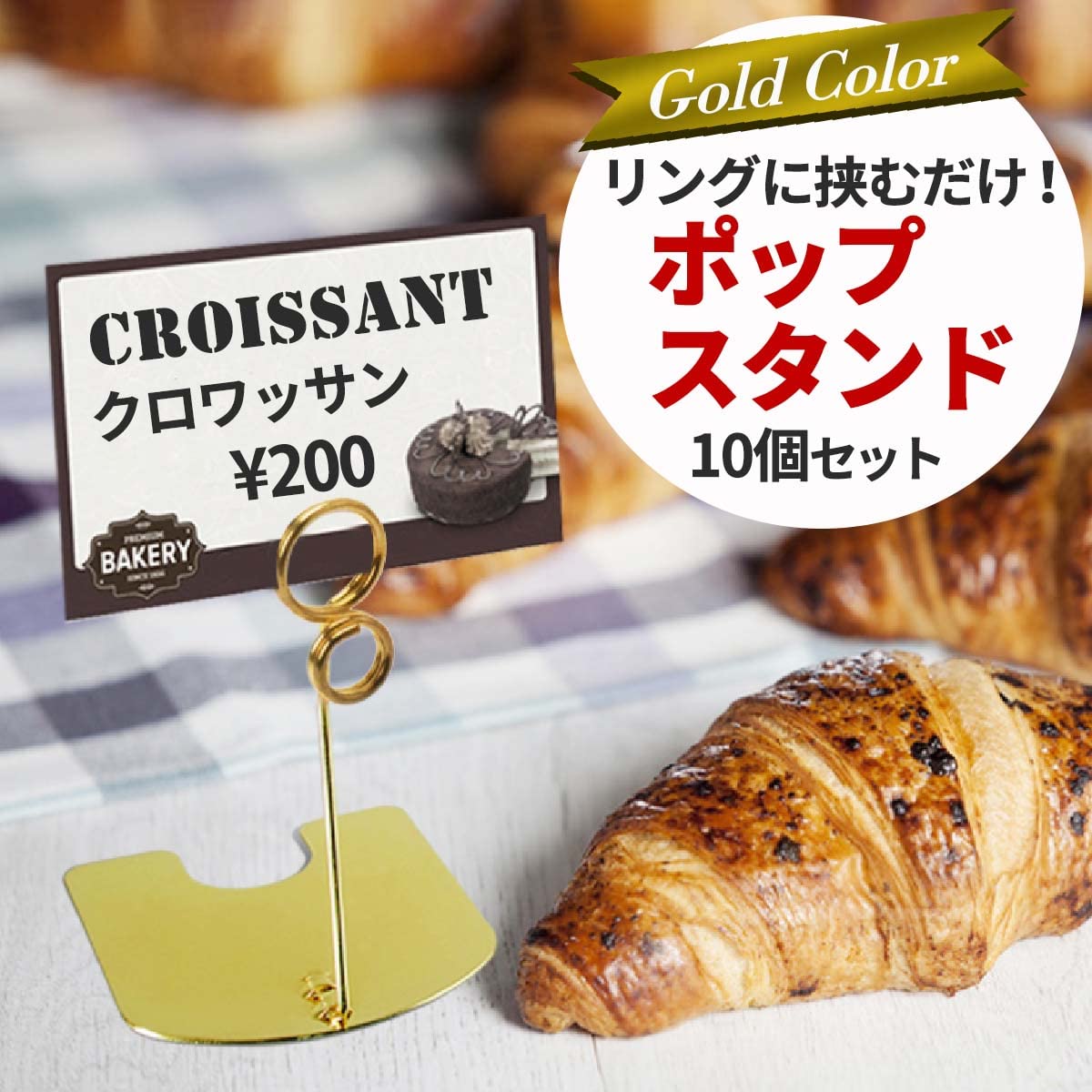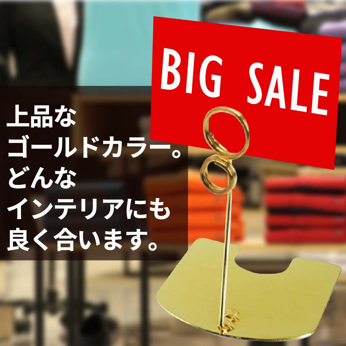 【商品名】 dodtazz ポップスタンド ゴールド 卓上 プライスカード 5個セット クリップ リングスタンド<br><br>商品ページをご覧頂き、誠にありがとうございます。<br><br>使いやすい卓上型のポップスタンド5個セットです。リングスタンド式で、ポップやプライスカードを挟むだけで、簡単に使用できます。ポップサイズを気にしたり、入れ替えたりする手間もありません。土台部分が広いので倒れにくいです。カウンターなどの狭い場所にもスタンドを設置することができます。<br><br>スッキリとしたシンプルなデザインで、ポップを効果的に見せることができます。きらりと光る美しいゴールドカラーはどんなインテリアにも合い、店舗を明るく、もっと魅力的に見せてくれます。<br><br>丁度いい高さで、商品の販売促進にピッタリ!売りたい商品の邪魔をすることなく、お客様の視界に入りやすい場所に設置できます。セールや商品情報のPOPを作成すれば、売上げアップにつながります。<br><br>お店での広告スタンドとしてだけでなく、ご自宅でメモクリップや写真立てとして使ってもおしゃれです。またパーティーや会議等で席札やメニュー表としてご使用頂くだけで、洗練された雰囲気を演出することができます。<br><br>【商品内容】POPスタンド 【セット内容】5個セット 【カラー】ゴールド 【サイズ】本体サイズ:横(土台)7cm×縦(土台)9cm×高さ10cm ※モニターの環境により、色の見え方に若干差が生じる場合がございます。