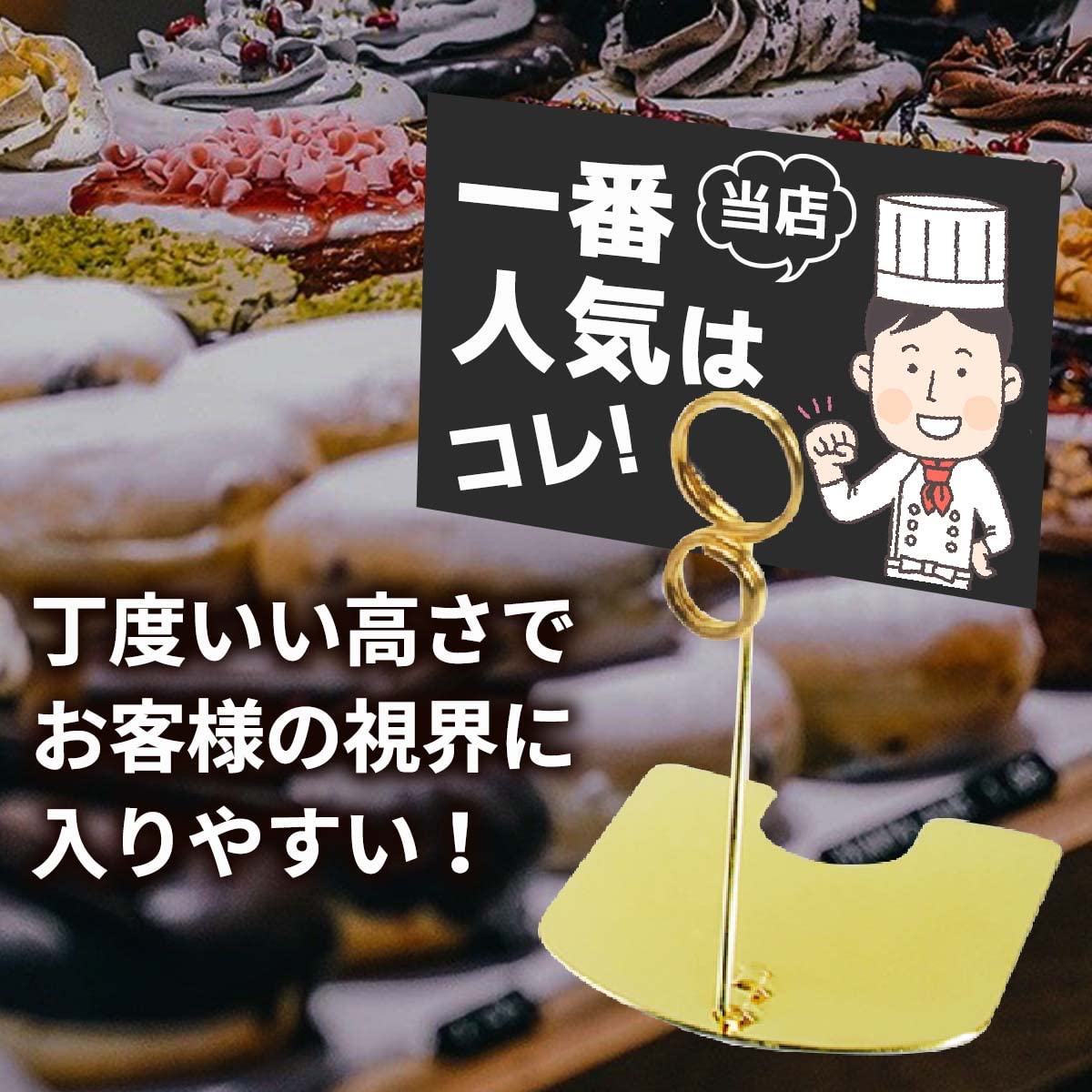 【商品内容】POPスタンド 【セット内容】5個セット 【カラー】ゴールド 【サイズ】本体サイズ:横(土台)7cm×縦(土台)9cm×高さ10cm ※モニターの環境により、色の見え方に若干差が生じる場合がございます。
