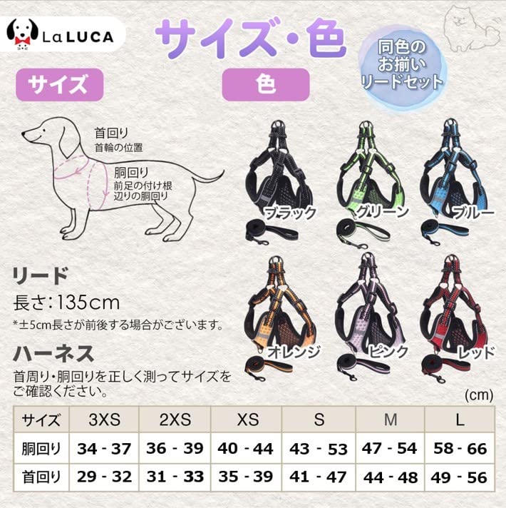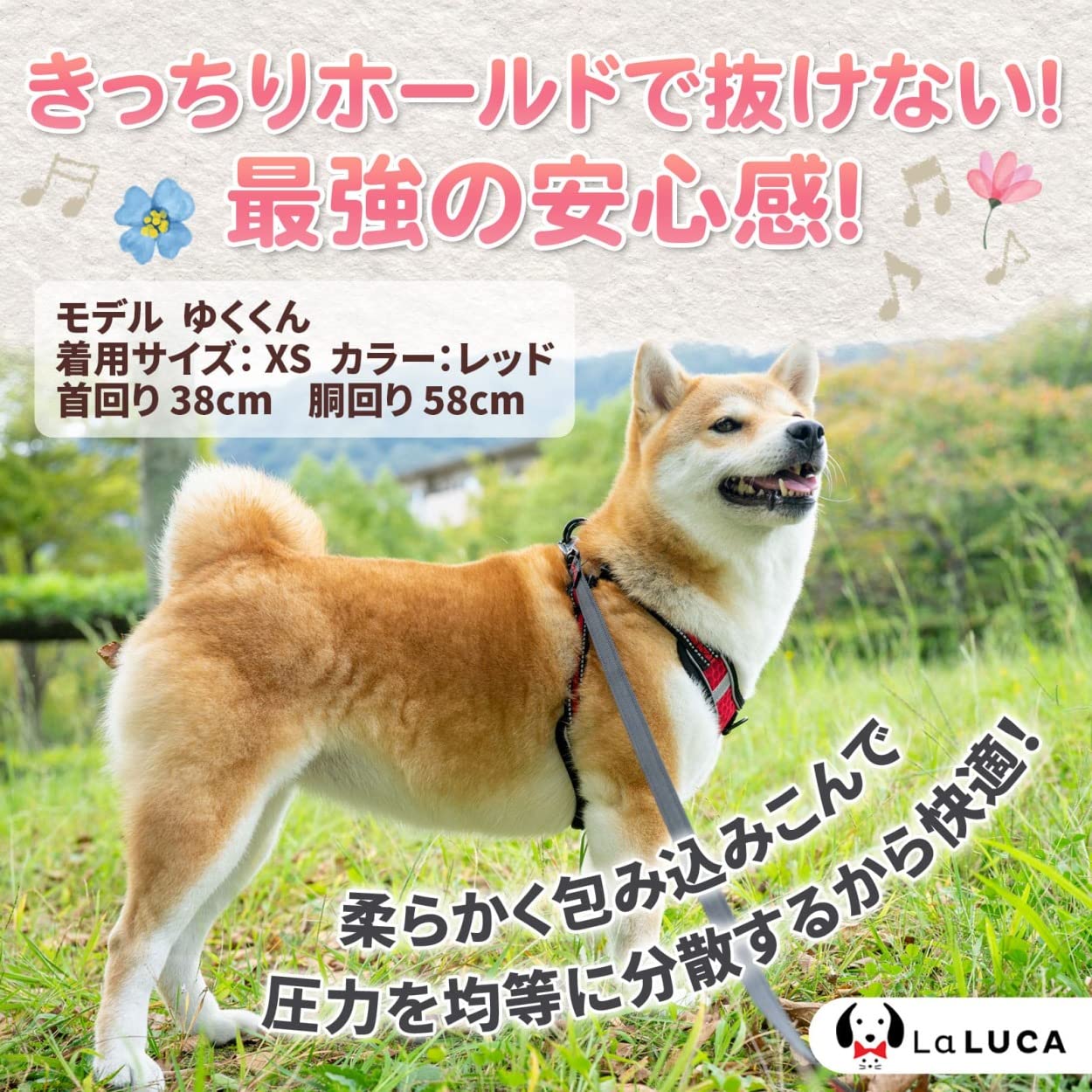 ★商品レビューを投稿でプレゼントキャンペーン中★ 商品レビューを書いてくださった方に、30日間延長保証をプレゼントします!! ※商品到着から7日以内に書いた方限定です。 ※本キャンペーンは予告なく終了します。 ★人気モデルの金子エリカさん推薦の可愛いハーネス★ 金子エリカさんのおススメコメントが届きました! 「ネット通販でも安心のクオリティのLaLUCAはおススメのブランドです◎ こんなにしっかりした素材をこの価格で購入できるのは驚き!」 【参考サイズ表】 胴回り(cm)/首回り(cm)/参考体重(kg)/参考犬種 3XS: 34~37 / 29~32 / 3-7 / チワワ・トイプードルなど 2XS : 36~39 / 31~33 / 5-8 / シーズー・ポメラニアン・パグなど XS:40~44 / 35~39 / 7-11 / ミニチュアダックス・キャバリアなど S:43~53 / 41~47 / 8~13 / 柴犬・コーギー・ラッセルテリアなど M : 47~54 / 44~48 / 10~15 / レトリーバー・秋田犬など L : 58~66 / 49~56 / 14~24 / ハスキー・ボーダーコリーなど ※参考体重・参考犬種は目安であり、サイズが合うことを保証するものではございません。