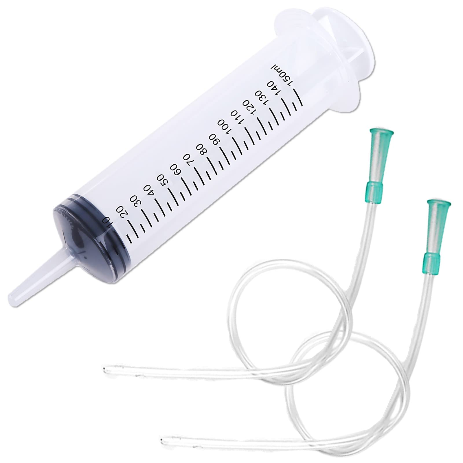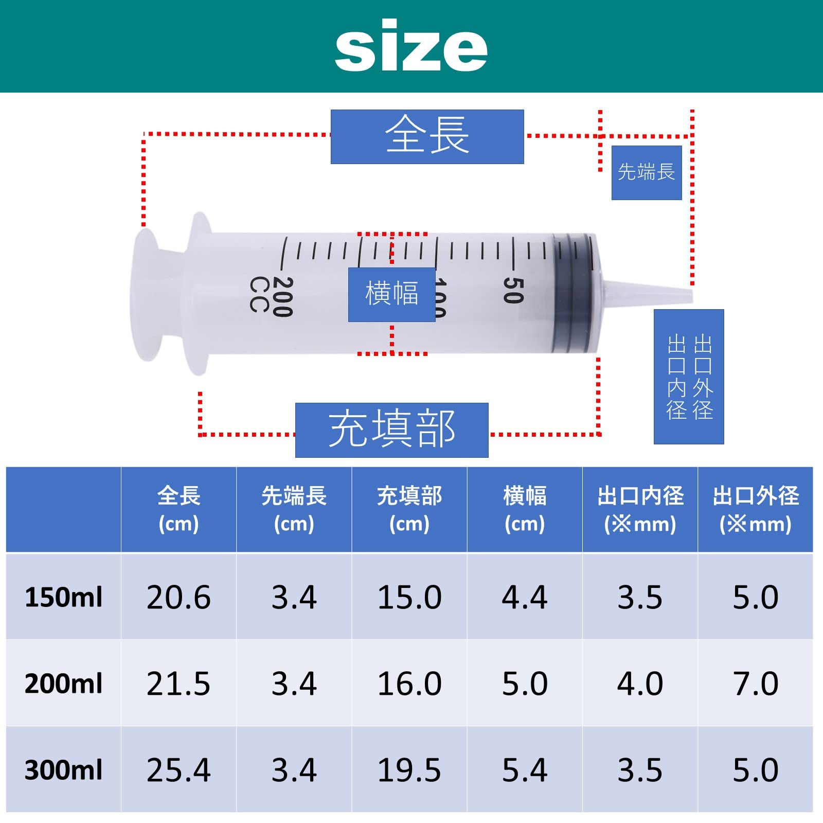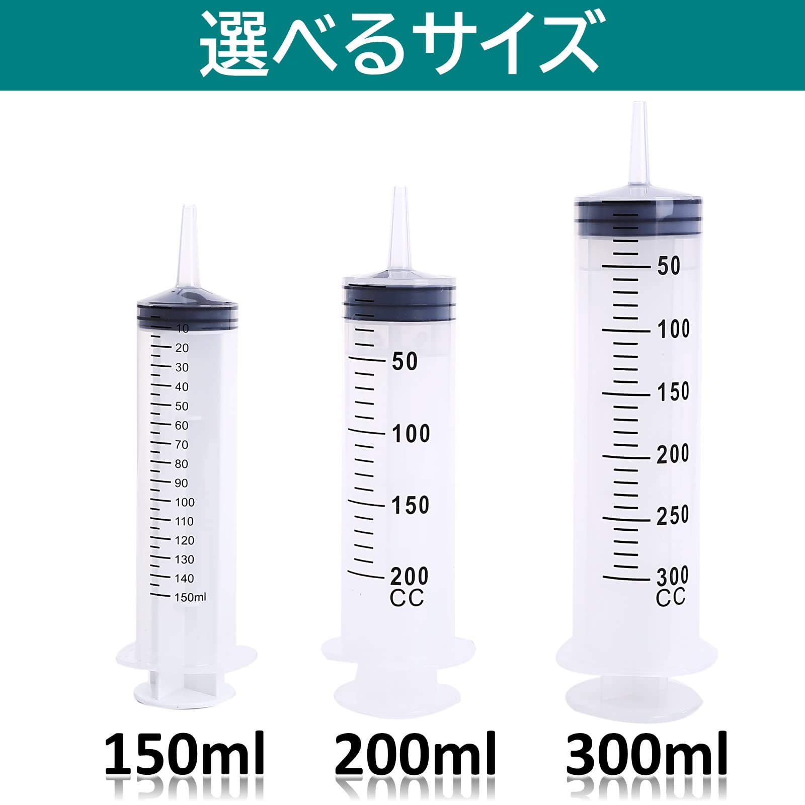 接続チューブ(約30cm長)2本付きのシリンジセット。150ml/200ml/300mlの3サイズをご用意しました。