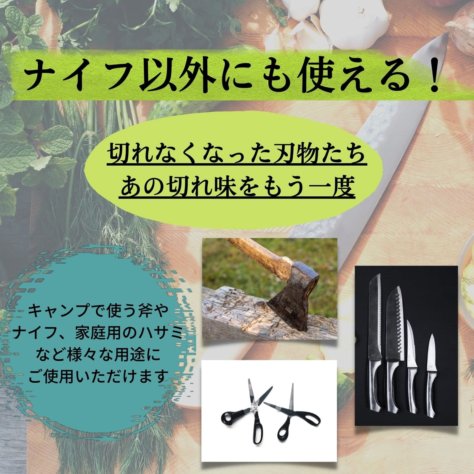 □【包丁以外にも】大工、理美容師、刀鍛冶の方、農具(ノミ、カンナ、超硬タガネ、ドリルビット)、家庭用包丁、業務用包丁、ハサミ、日本刀、包丁、鎌、鍬、セラミック砥石など硬質なので様々なものを研ぐことに適しています。
