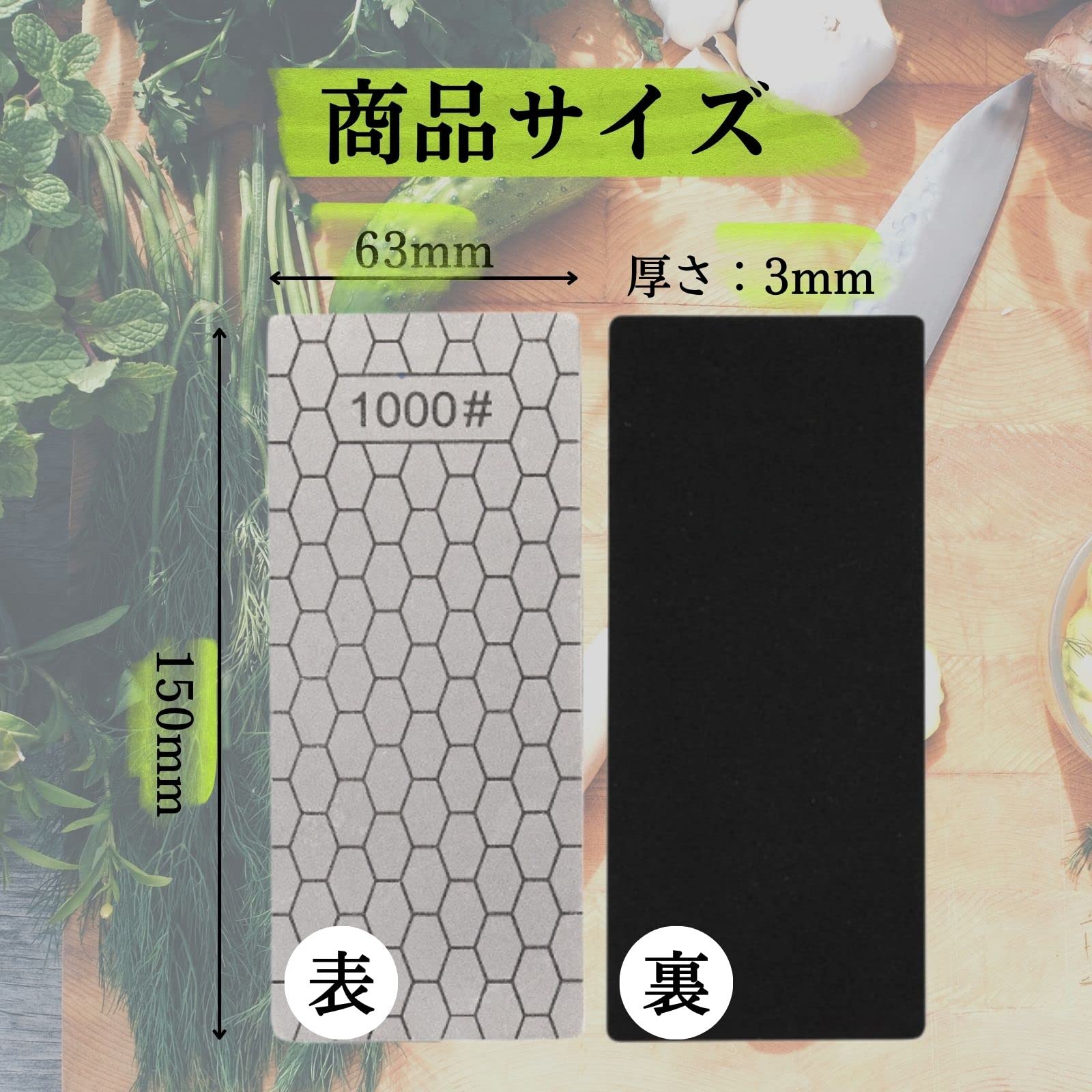 □【商品内容】ダイアモンド砥石:#400(荒研ぎ面)#1000(中仕上げ面)の2枚セット □【商品仕様】サイズ(#400 #1000):縦150㎜、横63㎜、厚さ:3㎜ □【新品の切れ味を】セラミックなどの硬い刃物も研ぐことができるシャープナーで、お持ちの包丁やナイフなど刃物を研ぐことに適しています。また、裏面はスポンジ貼りで研ぐ際に動きにくい仕様となっています。 □【包丁以外にも】大工、理美容師、刀鍛冶の方、農具(ノミ、カンナ、超硬タガネ、ドリルビット)、家庭用包丁、業務用包丁、ハサミ、日本刀、包丁、鎌、鍬、セラミック砥石など硬質なので様々なものを研ぐことに適しています。 □【今までの砥石と一味違う】超硬金属などの硬い金属の研ぎが可能なダイヤモンド砥石なので従来の砥石では出来なかったセラミック製の包丁にもご使用いただけます。また、一般的な砥石より摩耗に強く、砥石面の修正が不要です。