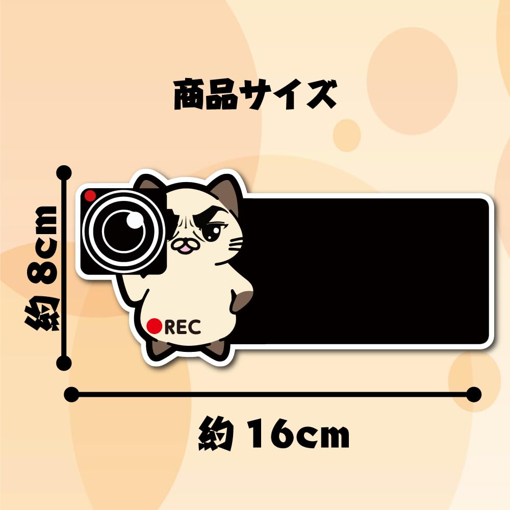 カメラを構える猫のステッカーです。<br><br> カメラを構えた可愛い(?)猫があおり運転を撃退してくれます。<br> <br> ・PVC素材(防水加工)ステッカーの材質は防水製のビニール素材でできていますので屋内はもちろん屋外にも貼れるステッカーです。<br> 車のボディやウィンドだけでなく、ウォールステッカーとしてもご利用いただけます。<br>※ウォールステッカーとして使用する場合ははがす際に壁紙が破損しないよう十分ご注意ください。<br><br> 使い方:貼る場所の水気・ホコリ・油をよく落としてから貼ってください。<br> 剥がす際はドライヤー等で温めながら行うと比較的容易です。<br><br> フッ素加工・シリコン加工・ポリエチレン・ポリプロピレン・木材・コンクリート・布地等は剥がれの原因になります。<br> ポリカーボネートは膨れの原因になります。<br> 上記の素材での使用はお勧めしません。