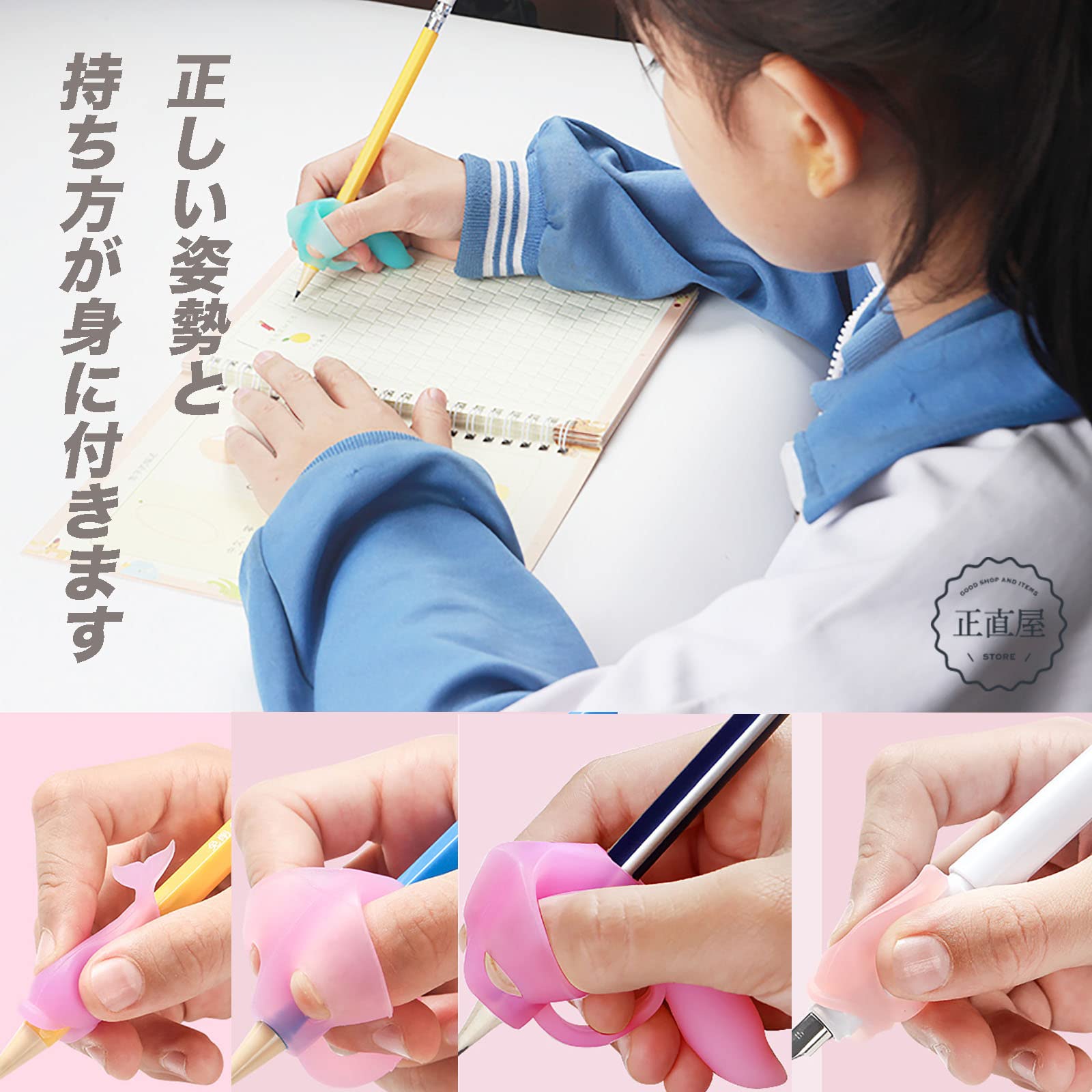 えんぴつ持ち方矯正グリップ、4種類5個セットのペングリップです。 <br> 最初は4本指グリップを使います。慣れてきたら3本指グリップ、徐々に小さなグリップに変えてゆくと、自然に正しい持ち方が身に付きます。 <br> 小さなお子様の指に合わせてラクに持てるように設計されています。やわらか素材で持ちやすくなっています。 <br> 鉛筆だけでなく、シャープペンシルやボールペン、万年筆など幅広く使えます。 <br> 4本指タイプ✕1個、3本指大型✕1個、3本指イルカ✕1個、3本指小型✕2個の4種類5個セットです。