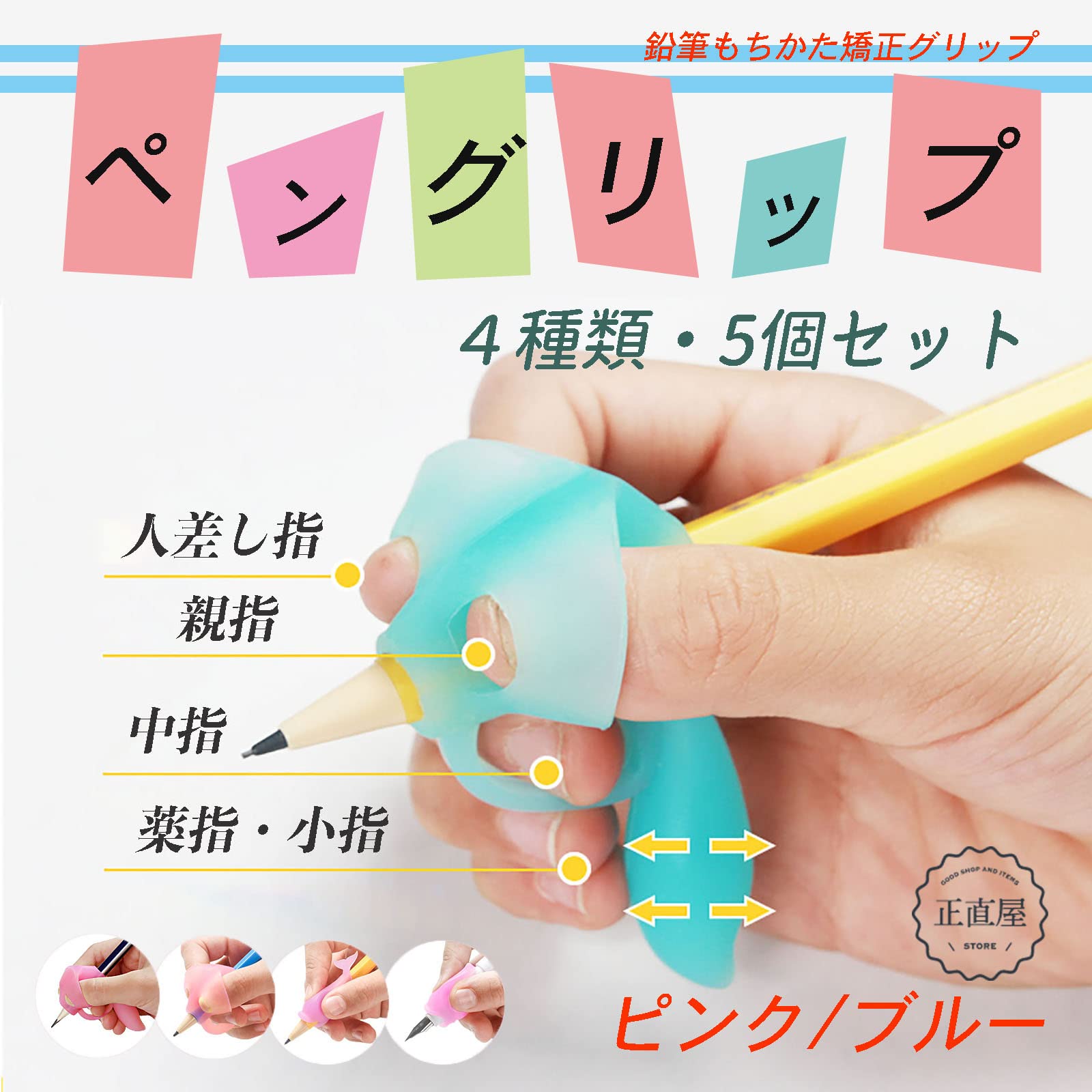 正直屋 鉛筆 持ち方 矯正 ペンの持ち方 5本指矯正 持ち方矯正 グリップ 子供 大人 リハビリ 高齢者 握り方 4種 5個セット (ブルー)