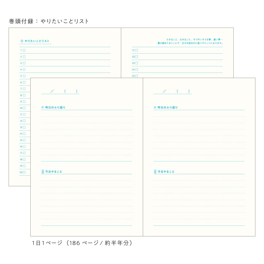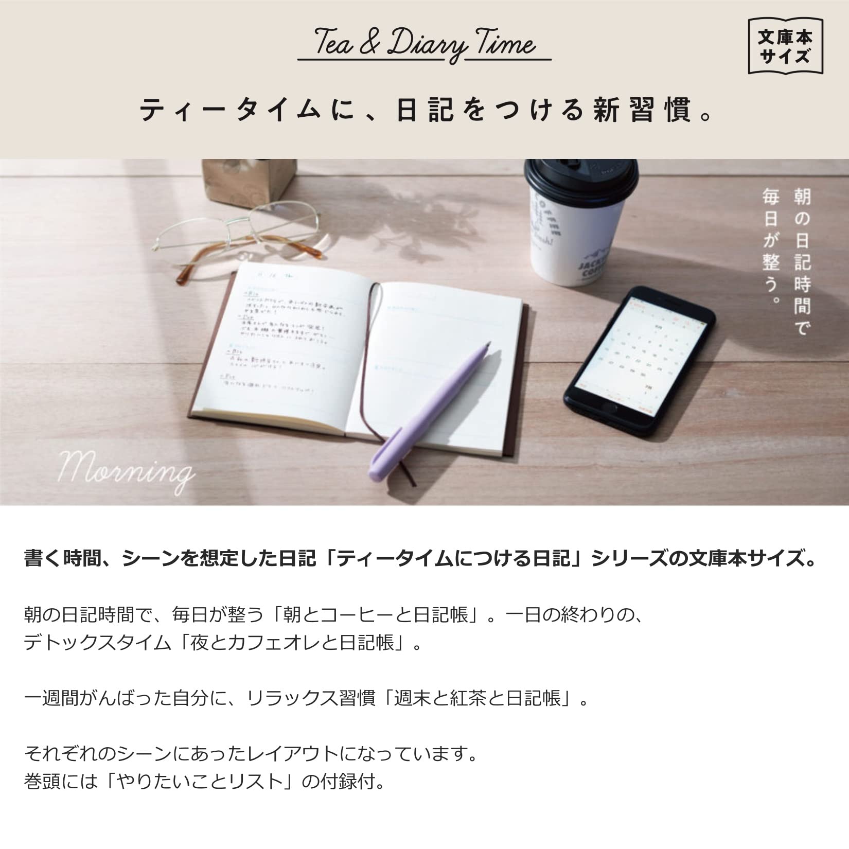 ティータイムに、日記をつける新習慣。それぞれのシーンにあったレイアウトになっています。巻頭には「やりたいことリスト」の付録付。(4ページ/80行)
