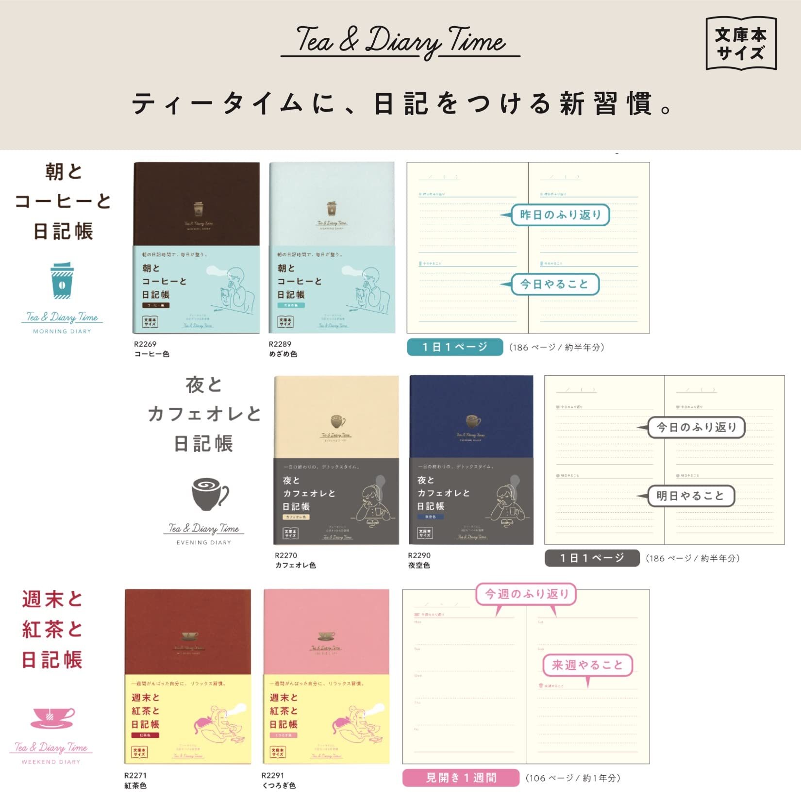書く時間、シーンを想定した日記「ティータイムにつける日記」シリーズの文庫本サイズ。朝の日記時間で、毎日が整う「朝とコーヒーと日記帳」。一日の終わりの、デトックスタイム「夜とカフェオレと日記帳」。一週間がんばった自分に、リラックス習慣「週末と紅茶と日記帳」。