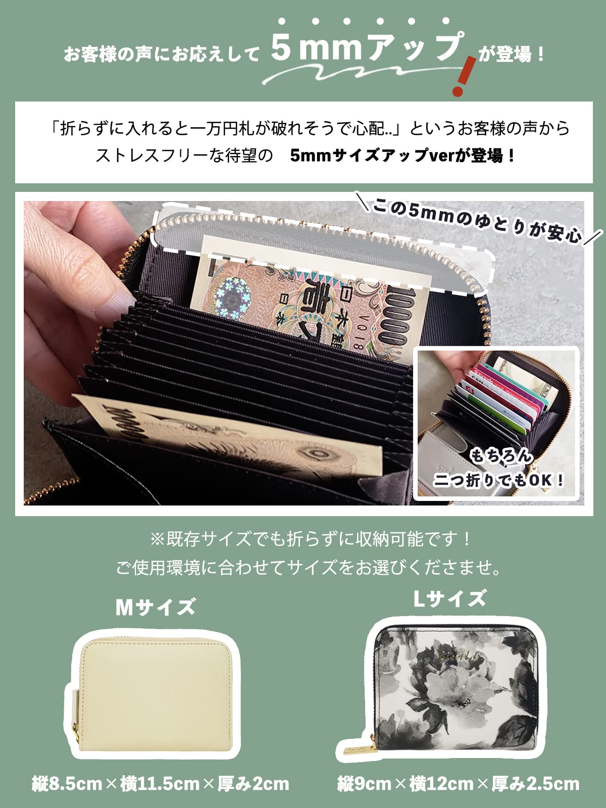 ■サイズ(約) 【Mサイズ】縦8.5cm×横11.5cm×厚み2cm 【Lサイズ】縦9cm×横12cm×厚み2.5cm■仕様:カード9枚収納、フリーポケット×2、小銭入れ×1 ■素材:サフィアーノ:合成皮革