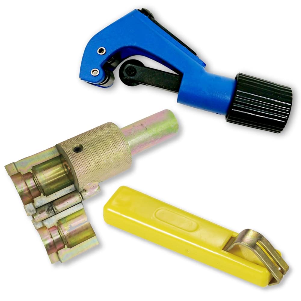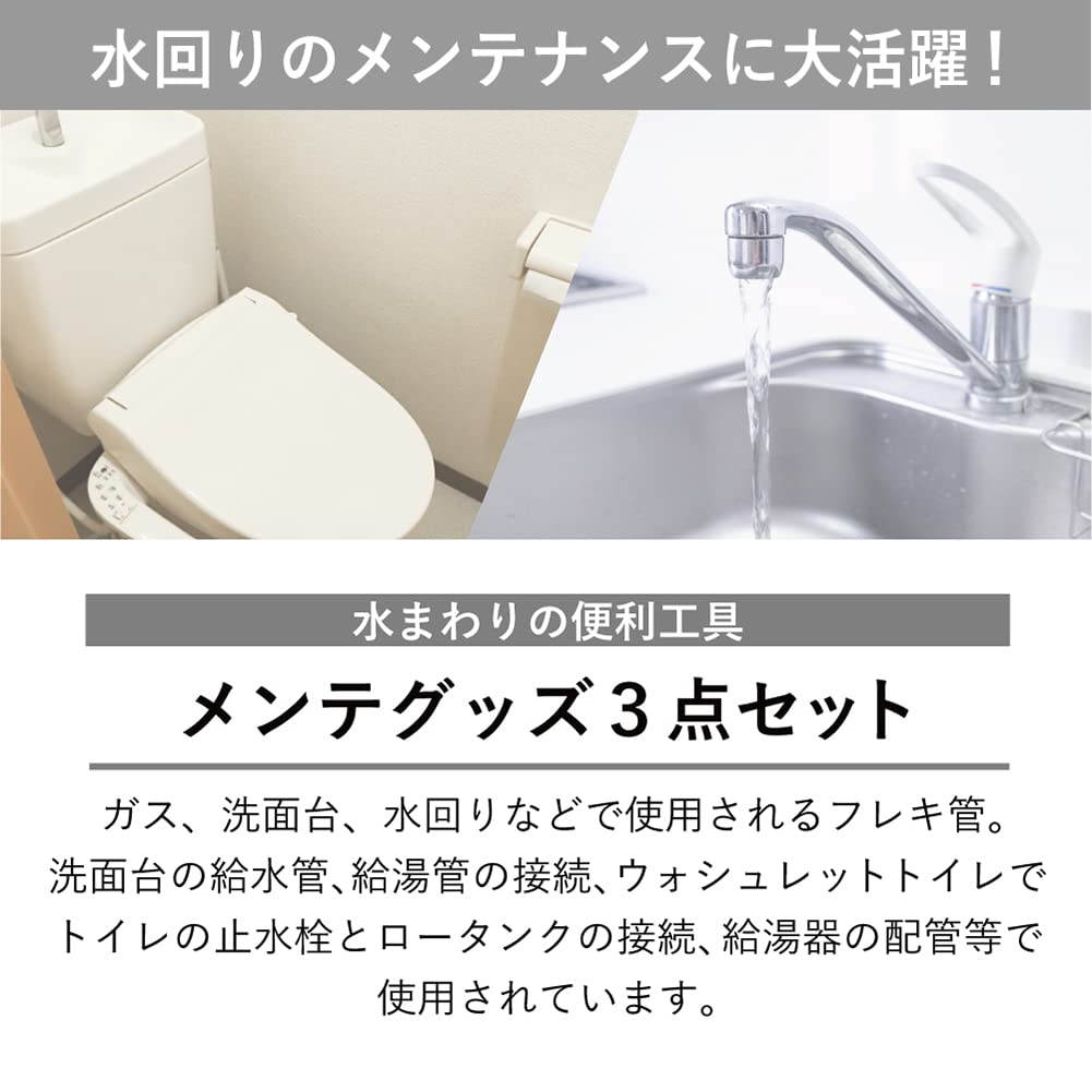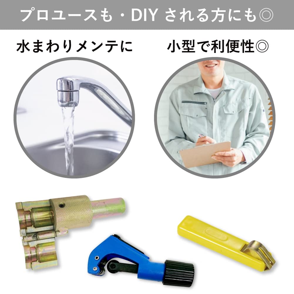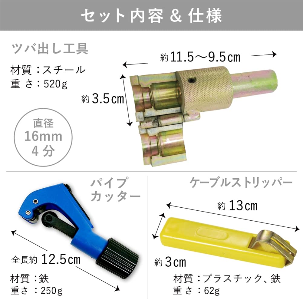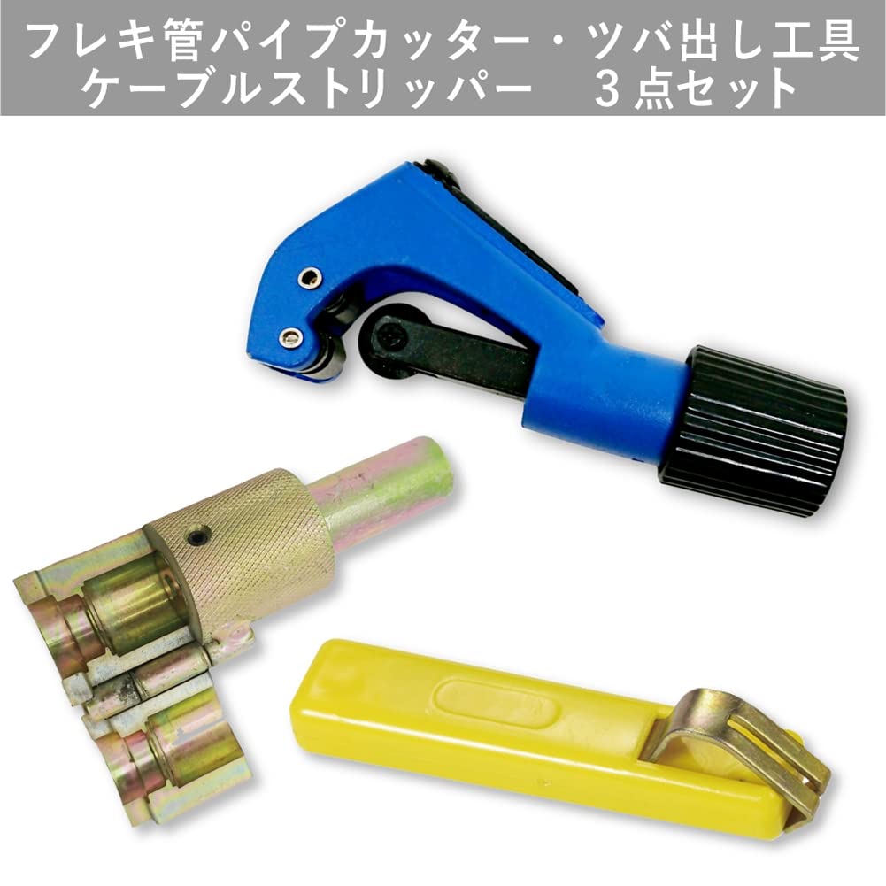 ツバ出し工具【サイズ】全長115~95mm 対応サイズ 直径16mm 4分【重さ】520g 【材質】スチール<br> パイプカッター【サイズ】全長125mm 対応サイズ 4-28mm 【重さ】250g 【材質】鉄<br> ケーブルストリッパー【サイズ】130mm×30mm 対応サイズ 26mm 【重さ】62g 【材質】プラスチック、鉄<br> フレキ管パイプカッター、ツバ出し工具、ケーブルストリッパー3点セットです。<br> ガス、洗面台、水回りなどで使用されるフレキ管。洗面台の給水管、給湯管の接続、ウォシュレットトイレでトイレの止水栓とロータンクの接続、給湯器の配管等で使用されています。 フレキ管のサイズ調整が必要になった際に本商品で端にネジ山を作ることができます。 大型の商品に比べ小さく持ち運びに便利で、収納場所も取りません。
