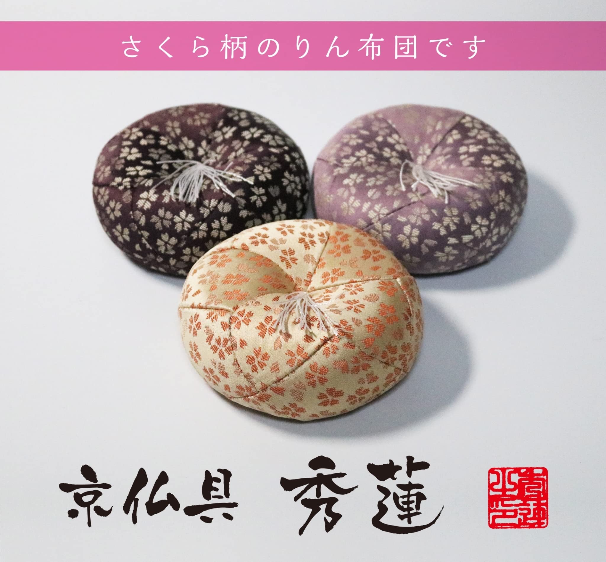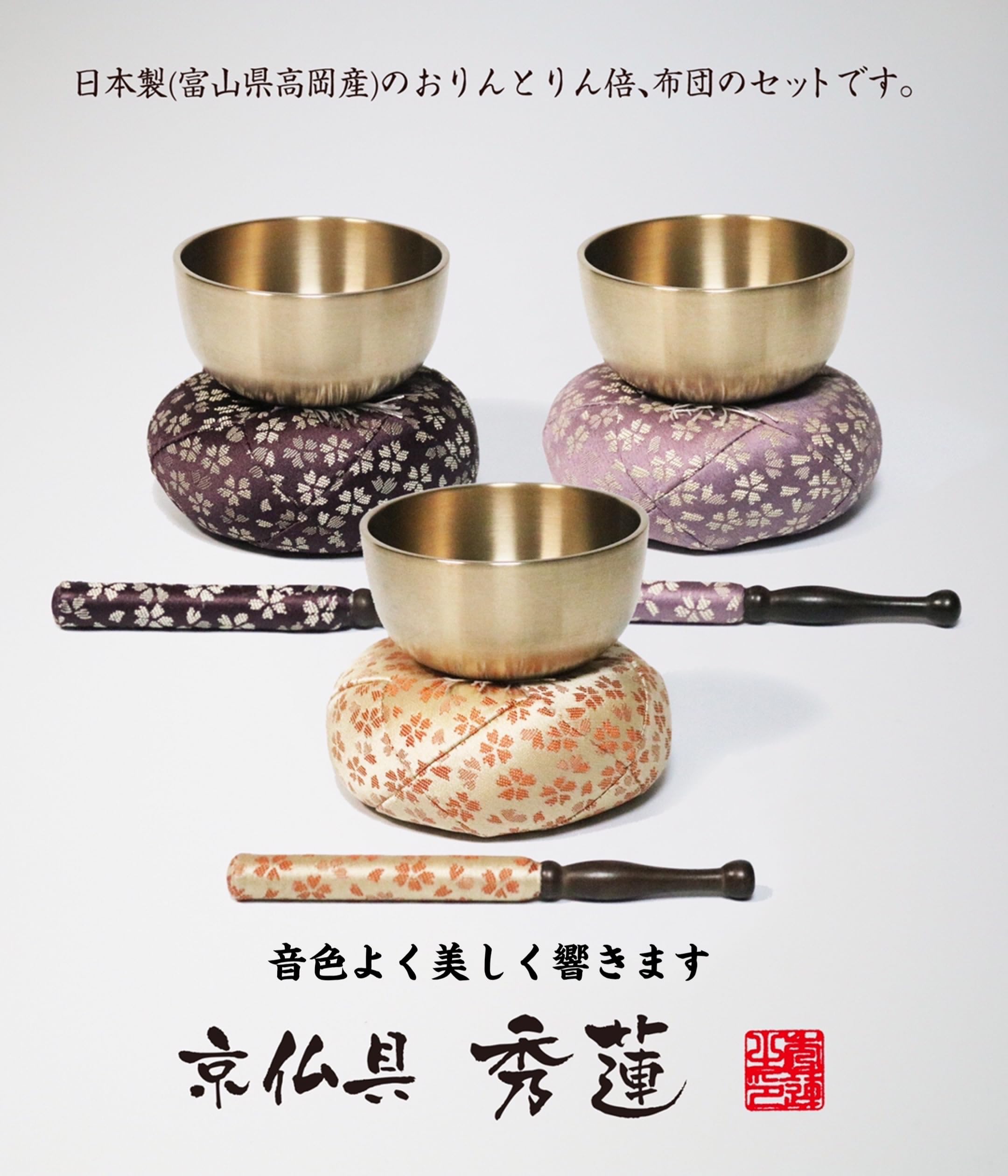当店人気の桜柄のおリンのセットです。御宗派問わずご利用いただけます。音色よく美しく響きます。お好みの色・大きさをお選びいただきご注文下さい。