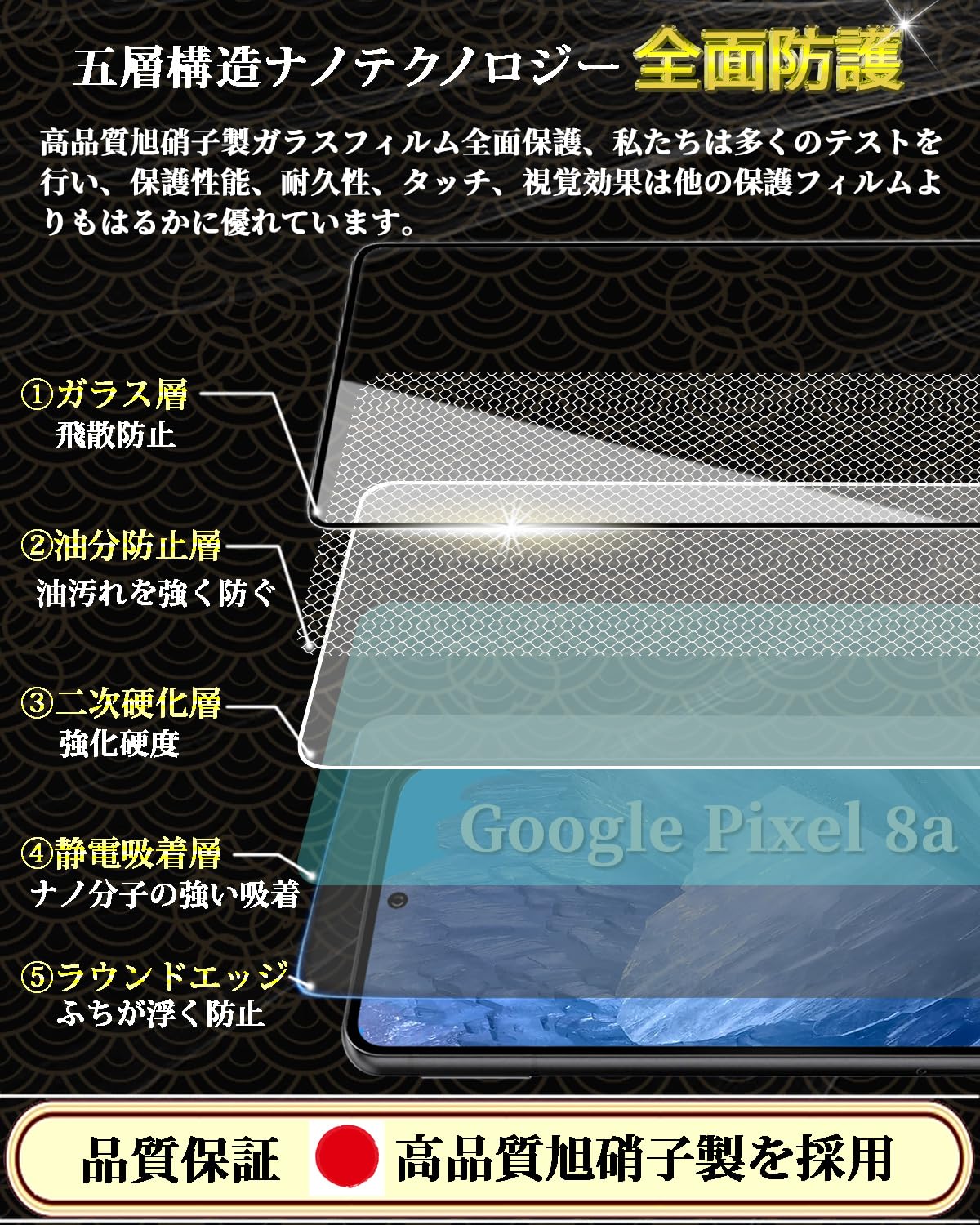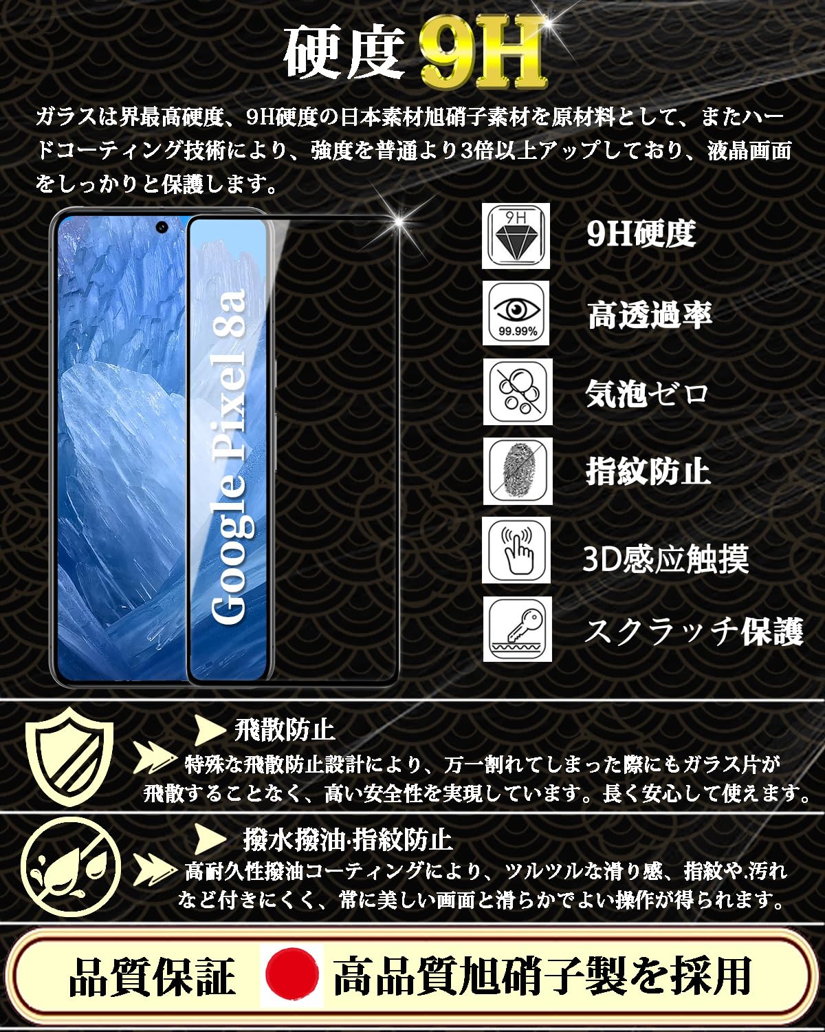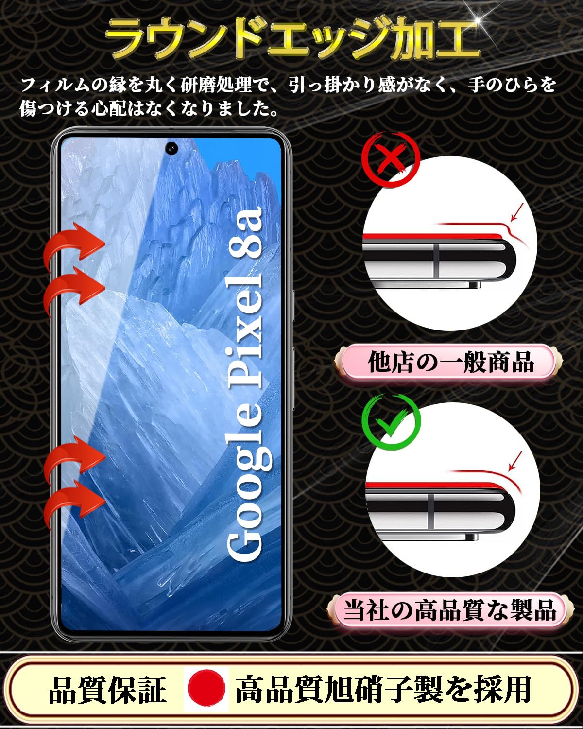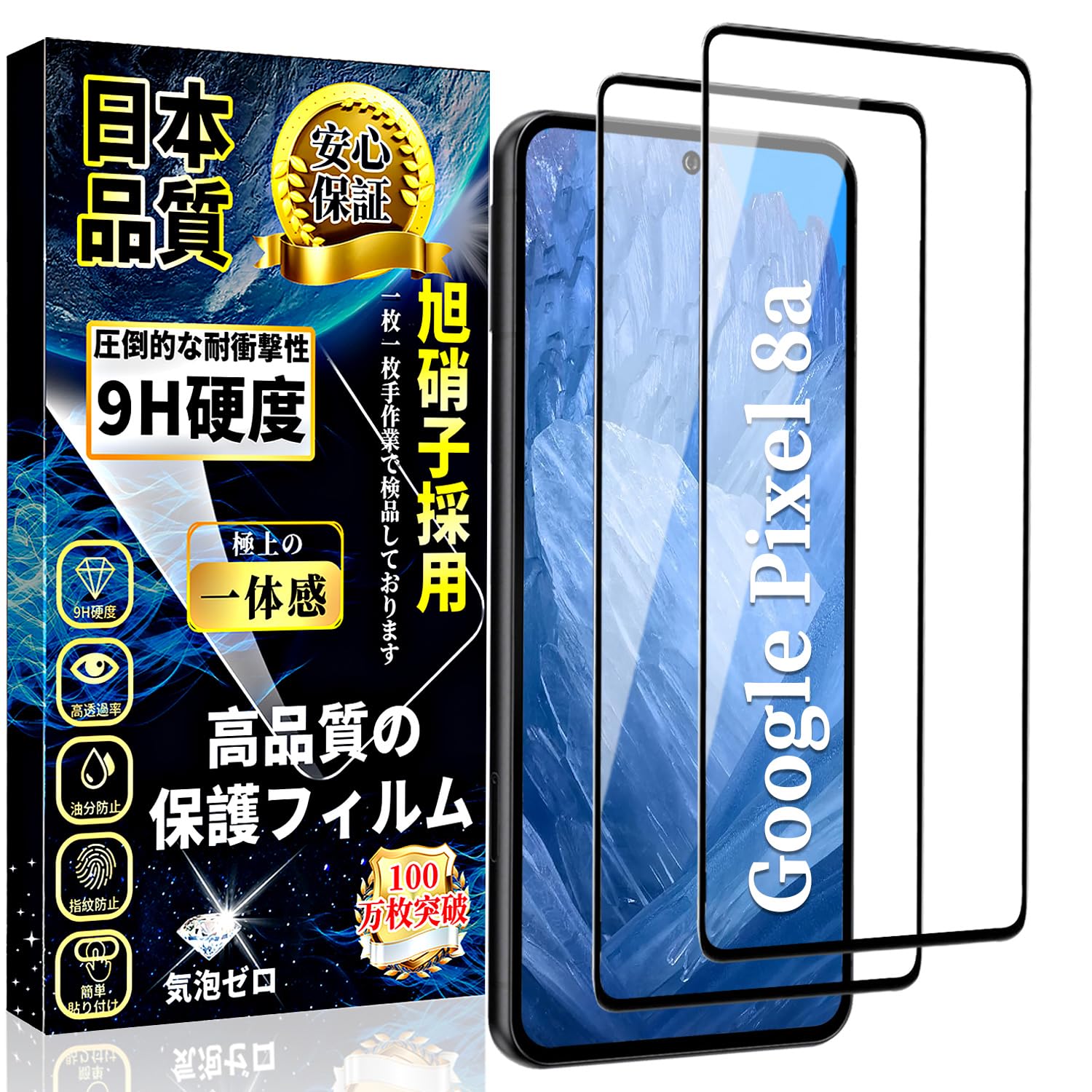 対応 Google Pixel 8a ガラスフィルム 全面保護 グーグルピクセル8a 強化ガラス 保護フィルム【2枚入り】 旭硝子日本製 硬度9H 自動吸着 気泡防止 指紋認証対応 高透過率 貼り付け簡単 キズ防止 撥水撥油 6.1''