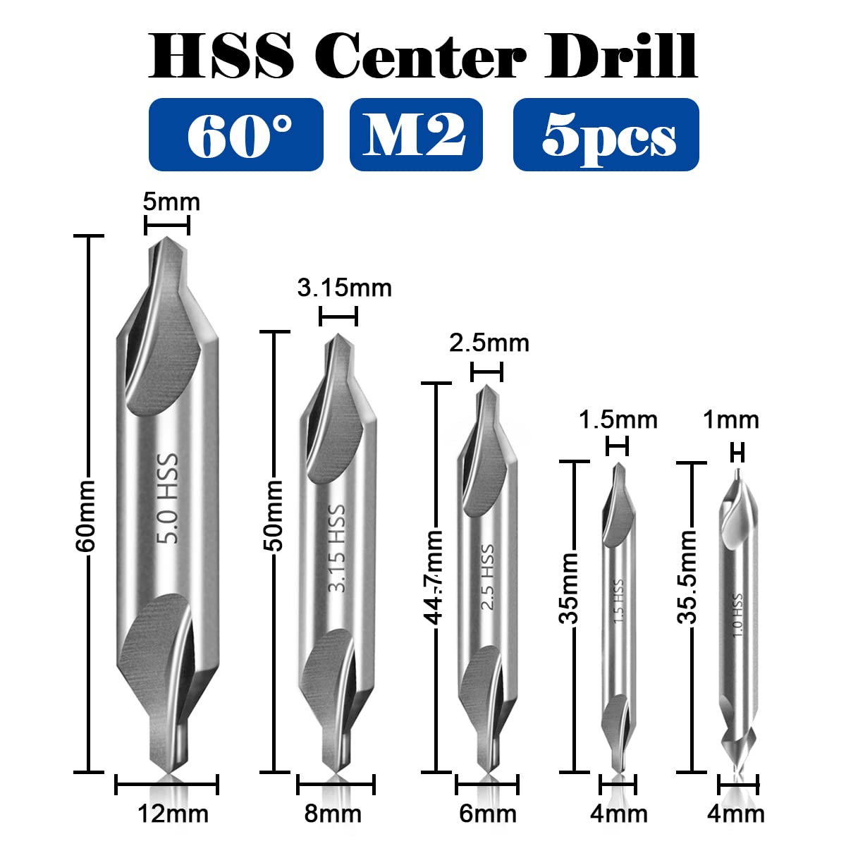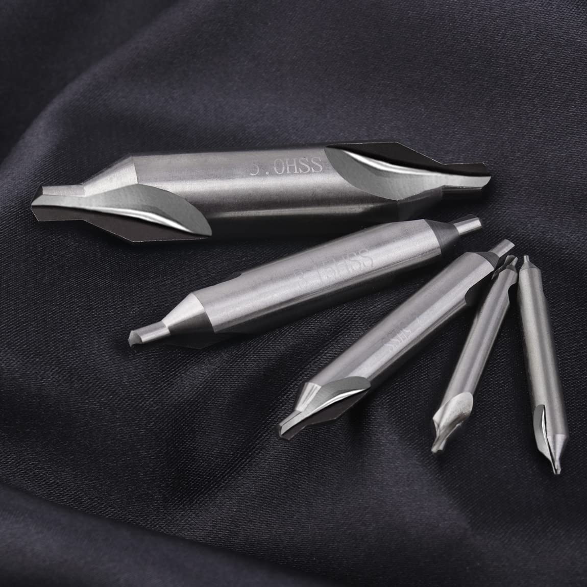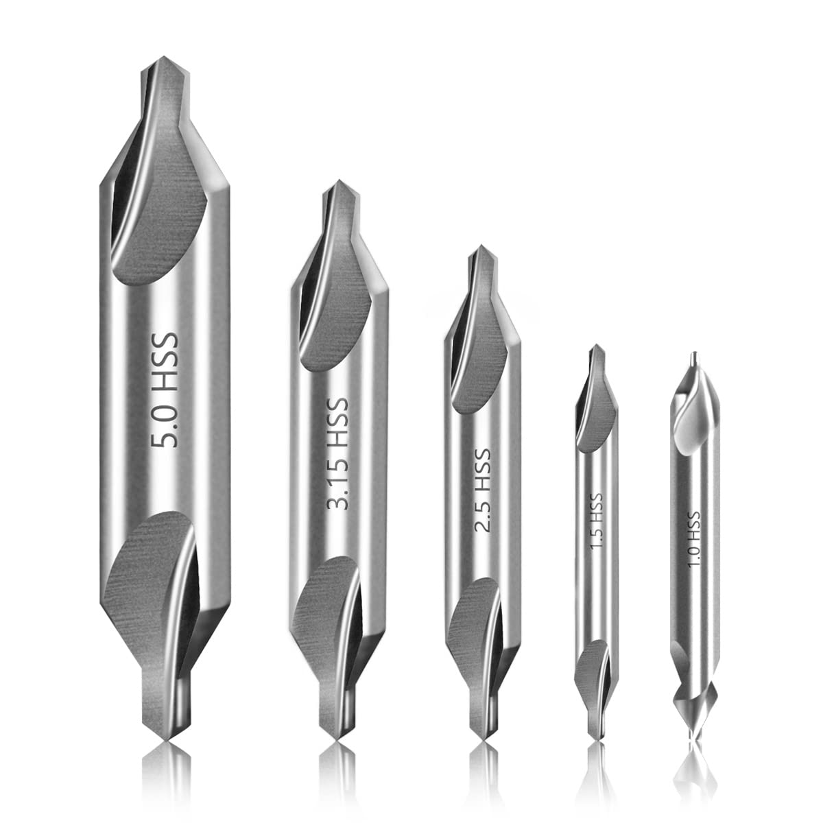 LWCUSNJ センタードリルビット5点セット 高速度鋼 60度角 センタードリルビットキット 皿穴ツール 旋盤金属加工用、サイズ 1 1.5 2.5 3.15 5mm