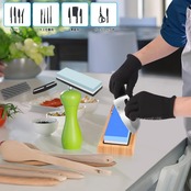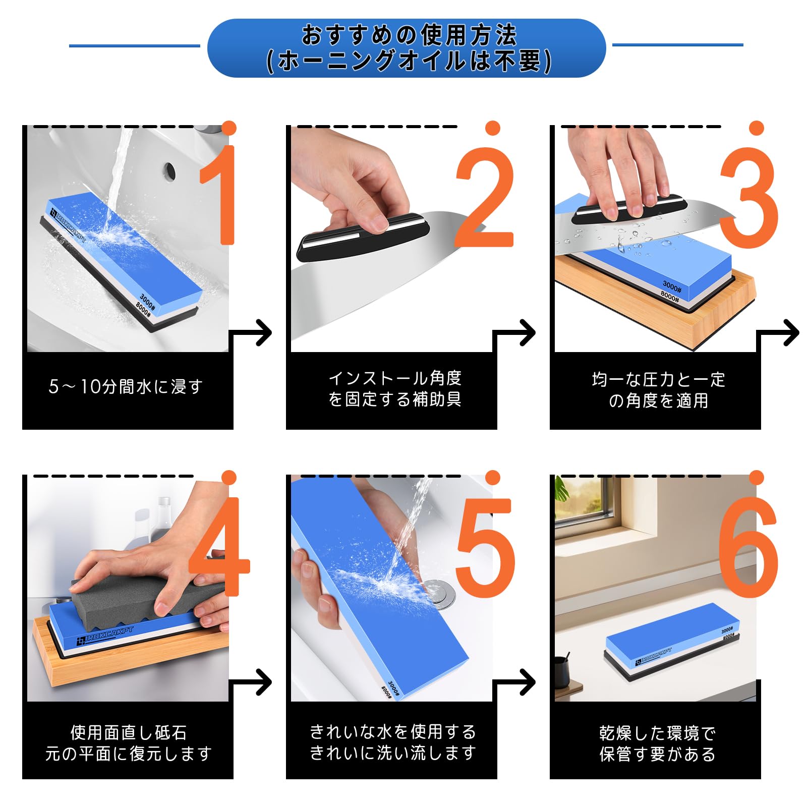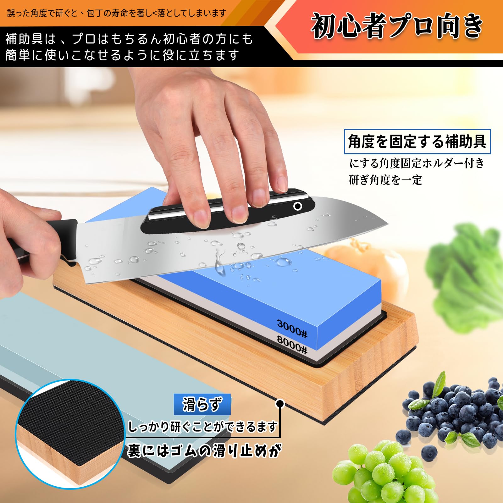 【安全性】ナイフを研ぐ際の安全は、最も重要です。それで,包丁研ぎ石キットには、2つの滑り止めラバー ベースと竹製の土台も(含滑り止めゴムのスペーサ)安定して研ぐ事が出来ます、角度ガイドにより、刃を研ぐ際に正しい角度を維持し、一定の圧力を安全に加えることができます、砥石面直し×1。でプロはもちろん、初心者の方でも簡単に使いこなせる