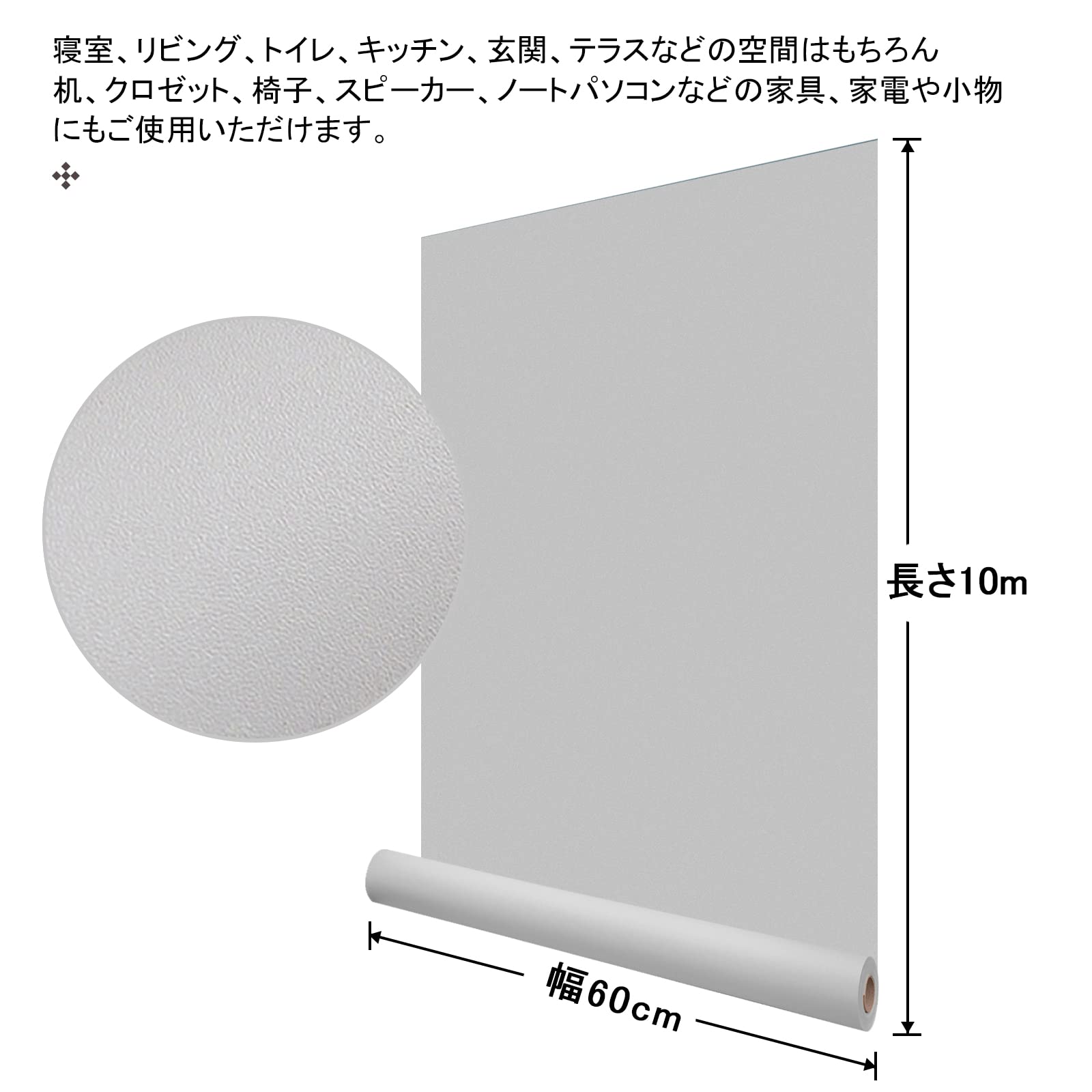【商品仕様】サイズ:約幅60cmx長さ10m 厚さ:0.2mm ちょうどいい厚さ:厚みがあり透けにくく、厚くすぎでもなく曲がり角にも貼りやすいです。 タイプ:サラサラした壁紙(つやけし) 素材:PVC カラー:ライトグレー