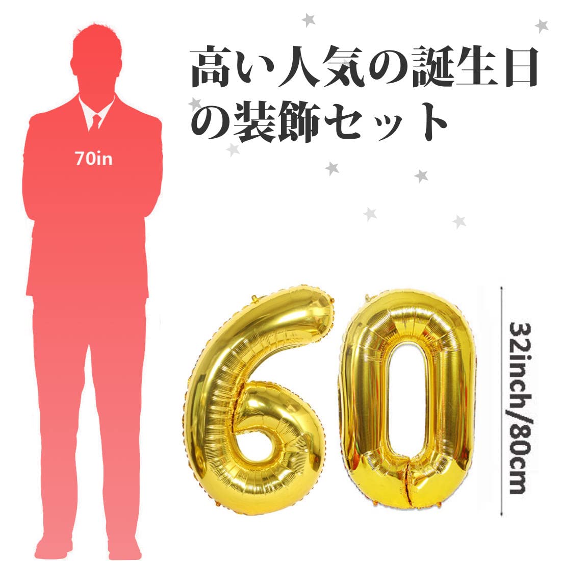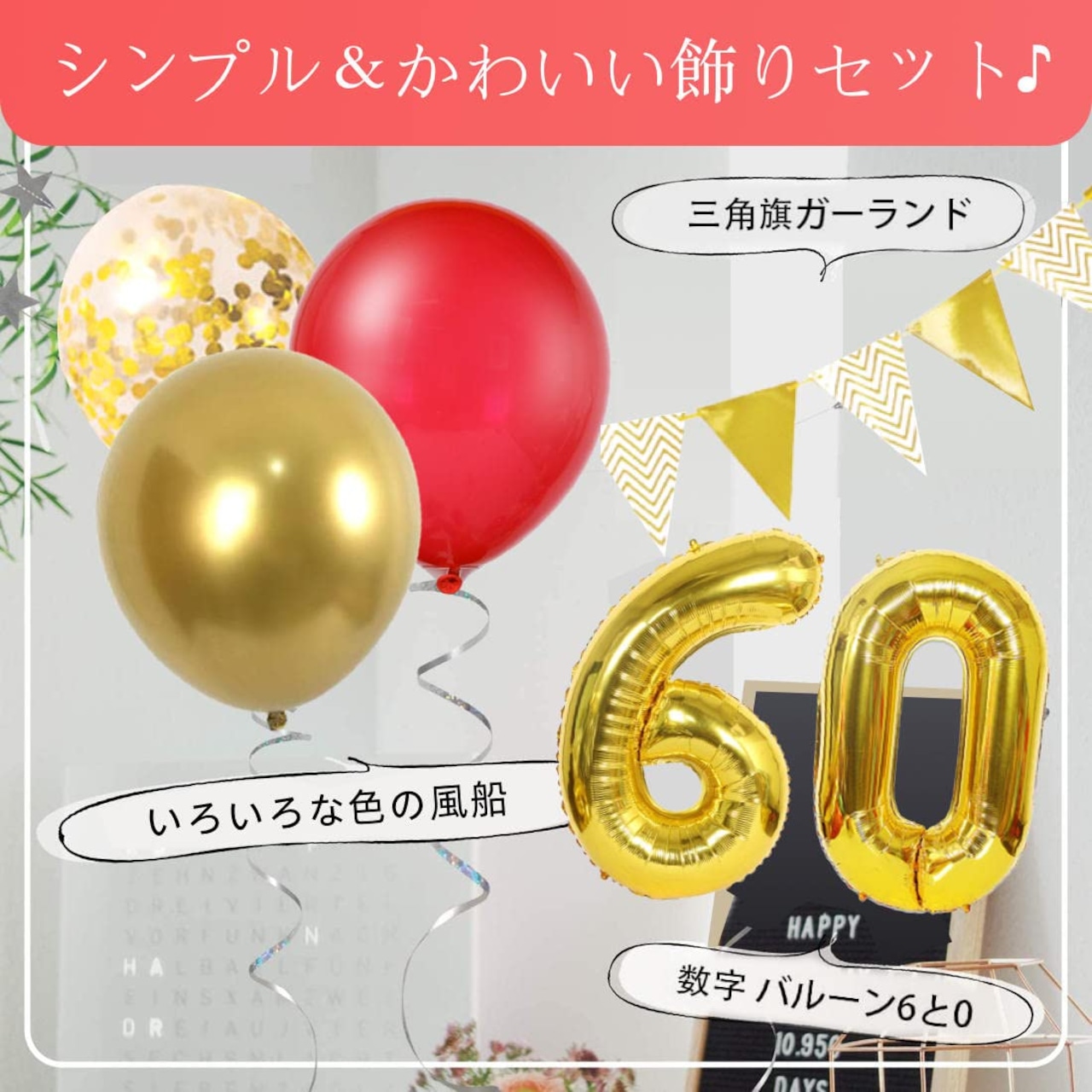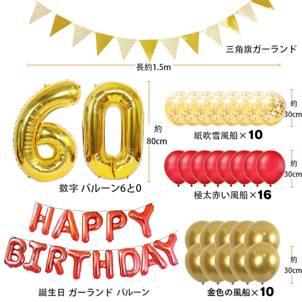 還暦祝い 60歳 数字バルーン 誕生日 飾り付け 大きい 風船 HAPPY BIRTHDAY 赤とゴールド 大人 女性 男性 プレゼント デコレーション バースデーバルーンパーティーお祝い飾り付けセット