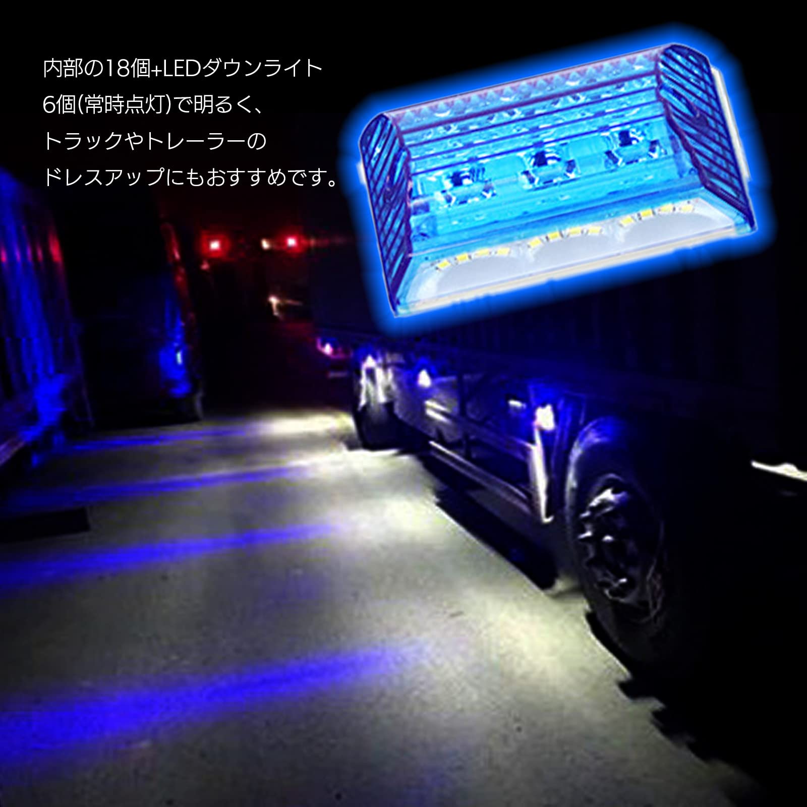 本製品は、内部に18個のLEDと6個のダウンライト(常時点灯)を搭載。強い光を均一に拡散し、走行時の安全性を高めるだけでなく、スタイリッシュな外観を演出します。特に夜間の視認性向上に貢献し、後続車両や歩行者に対しても視認しやすい状態を保ちます。トラックやトレーラーのカスタム用途にもおすすめで、存在感のあるデザインが特徴です。