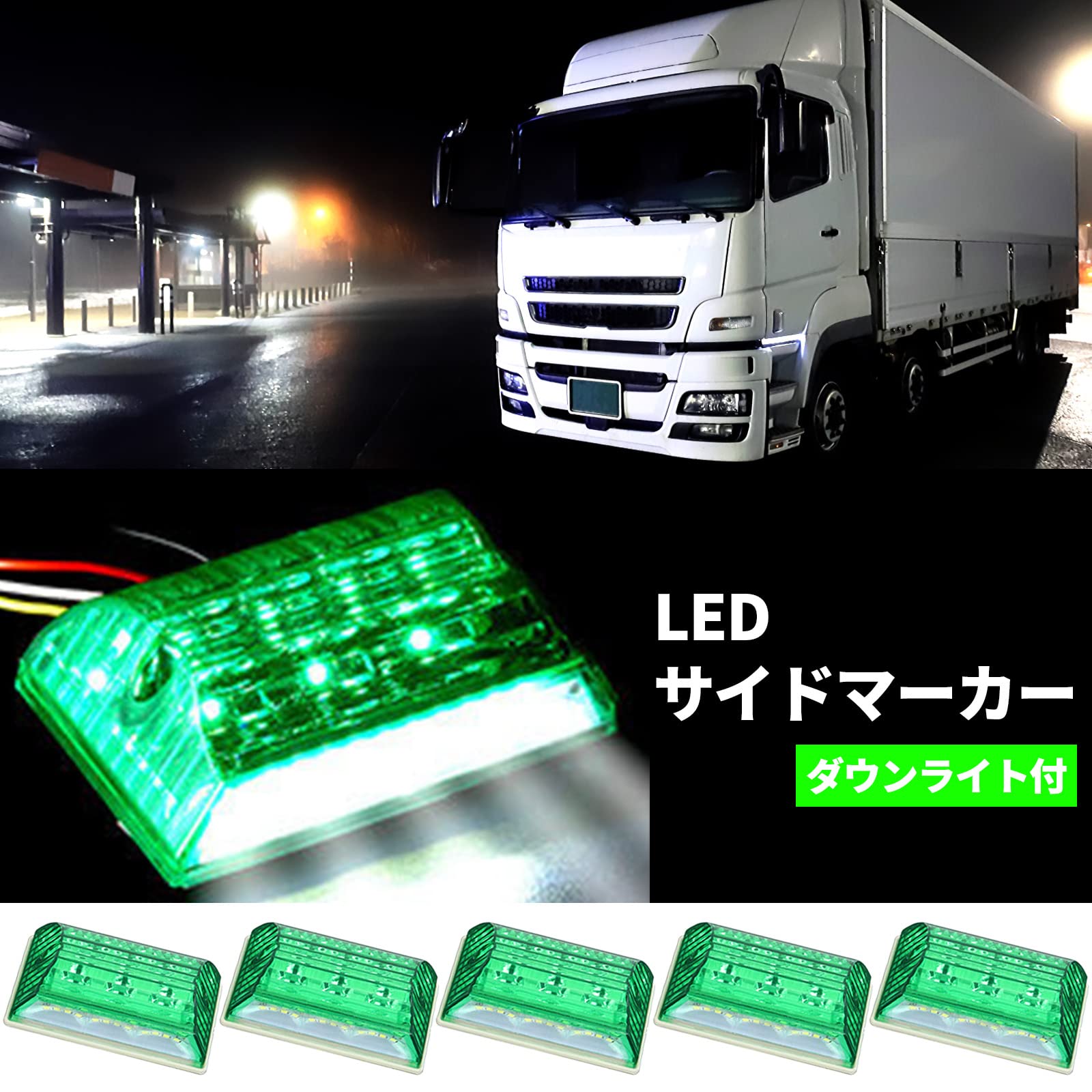 モデルノ ラ テール サイドマーカー トラック 24V アンダーライト付き 防水 LED 102mm×87mm×34mm YM-212-N1 グリーン 5個
