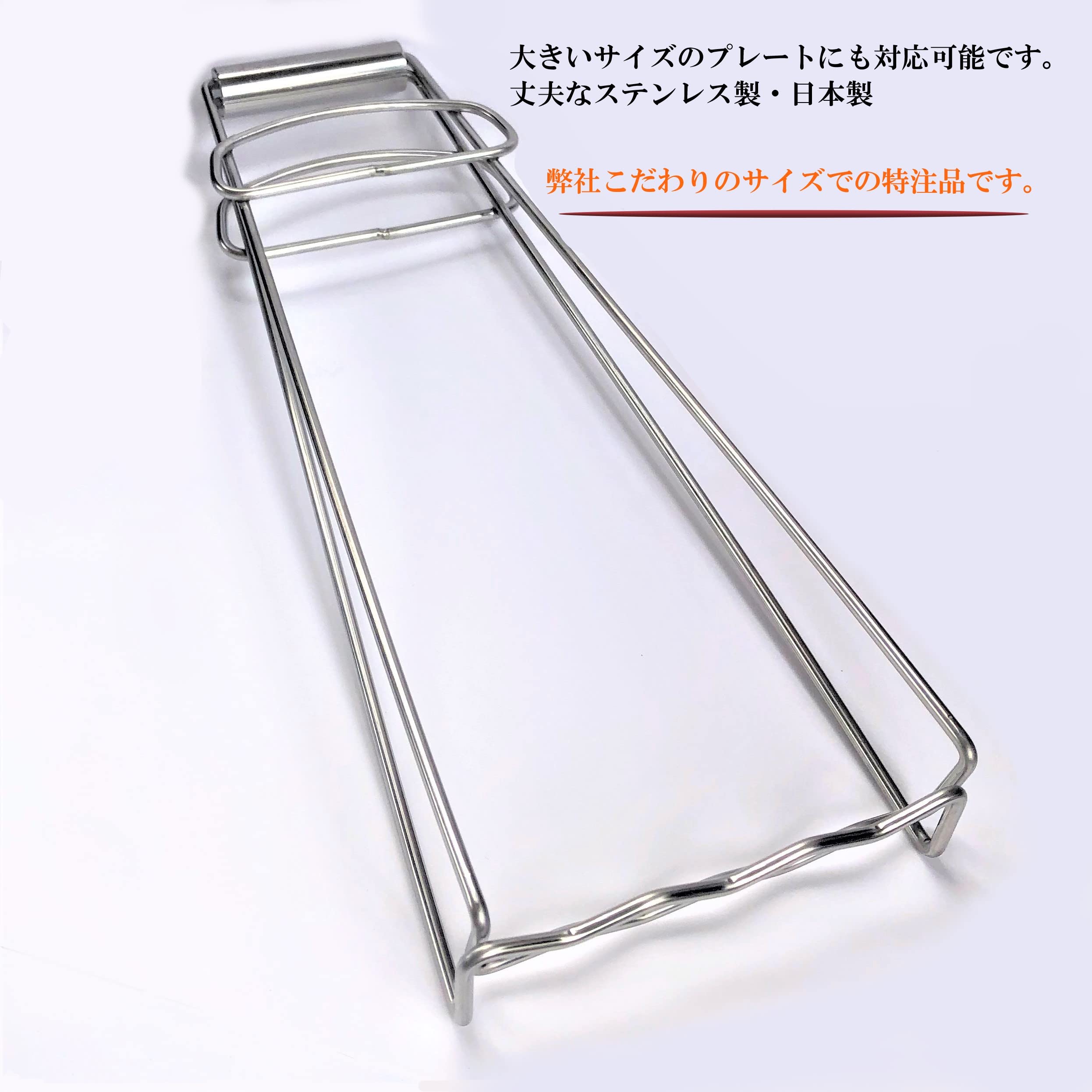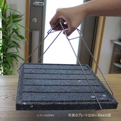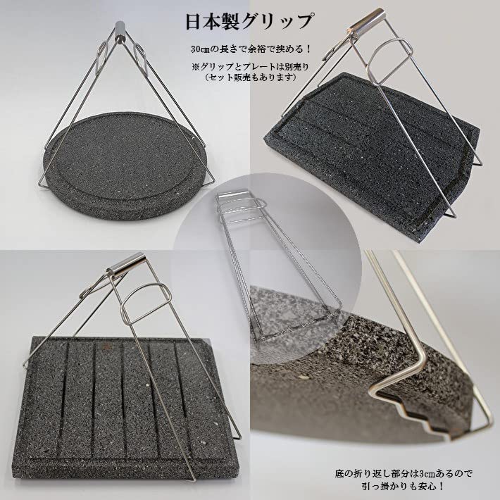 プレートの持ち運びに便利なグリップ。 当社の美味焼溶岩プレートはもちろん、重い土鍋や鉄板などにも使えます。 焼肉を焼いてキッチンから食卓へ、食後は食卓から流し台へ 一度温まったプレートは素手で触るには熱くて鍋つかみ等でも容易ではありません。 冷めるにも時間がかかります。 そんな時、このグリップを使えば熱さを気にせず持ち運ぶことができます! 美味しくいただいた後にはこの専用グリップで運べば後片付けも安心で楽々。 安心、安全のこだわりの溶岩プレート「美味焼-Umayaki-」 プレートを持ち運ぶためのグリップもこだわりました。 【こだわり抜いた日本製グリップは当社のオリジナル!】 (1)長さ 25cmより大きいサイズのプレートにも対応できるハンドルの長さ30cm (2)ハンドル部分はぐらつかないよう片方固定 (3)プレートを引っ掛ける部分は余裕の3cm しかも、片方は少し深く折り曲げてあるので安定感抜群 (4)ハンドルを長くすることで女性でも大きいサイズのプレートが持てます! サイズ約:高さ30×底辺11×上辺7cm(底辺部分は3cmの折り返しあり) ※納品書をお荷物に入れておりません。必要な方はご連絡ください。