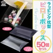 【商品仕様】セット内容:ピローボックス ×50個セット サイズ:約8.0cm×約5.0cm×約2.0cm カラー:透明 1個あたりの重さ:約26g ※モニターの環境等により、色の見え方に若干差が生じる場合がございます。