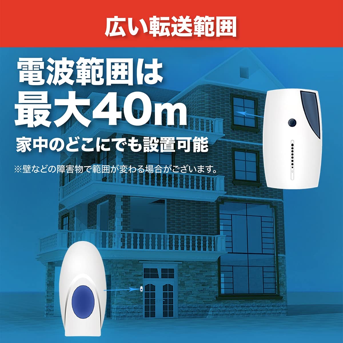✅送信機の電波は最大40mまで届きますので、家中ほとんどの場所に置けます。( 障害物を含まない場合。)