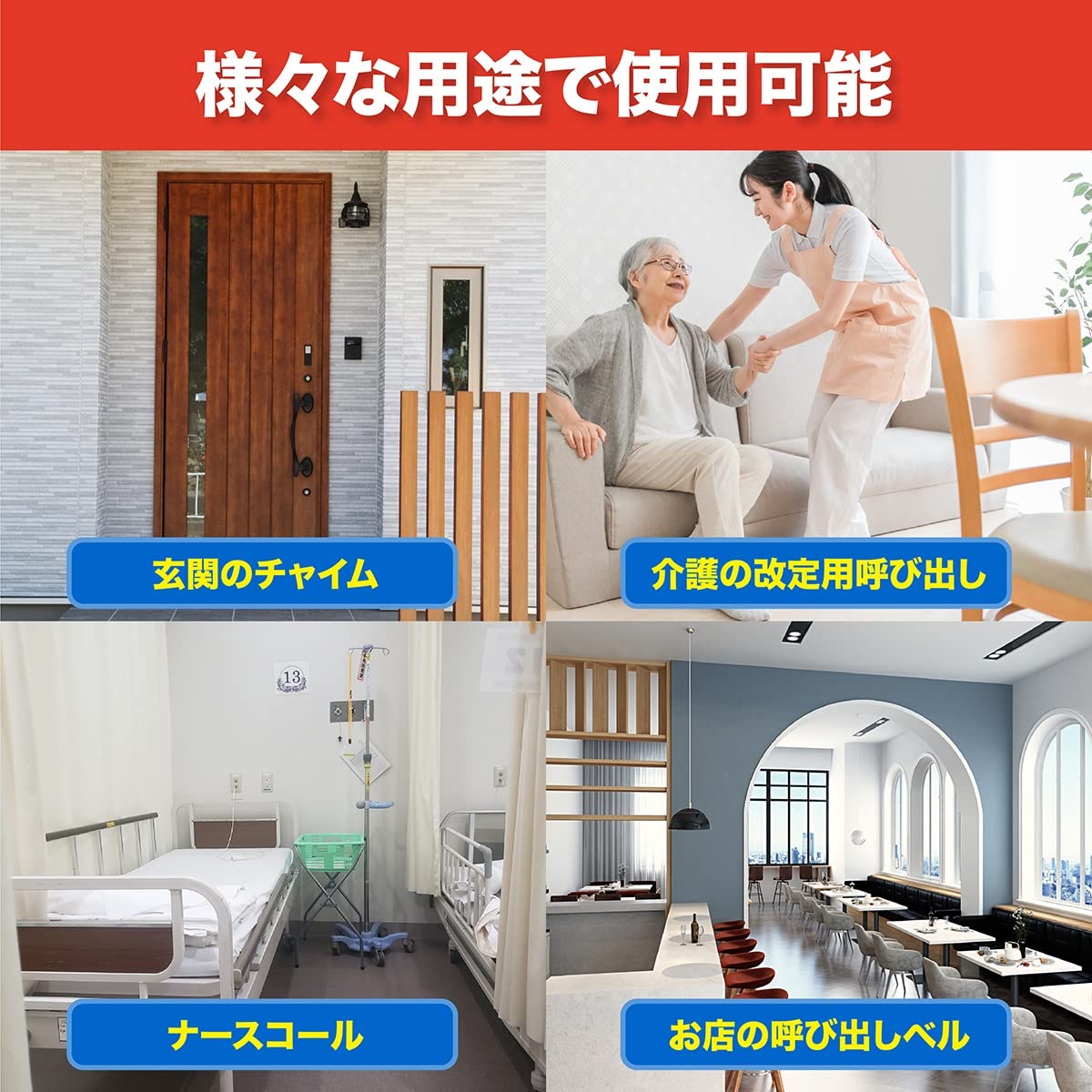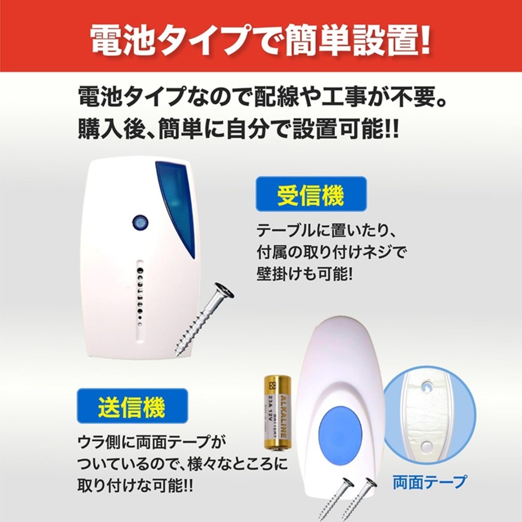 ✅【受信機】「 電池:単4型2本(別売り)」 「サイズ:高さ9.5cm 横5.6cm」 「付属品:取り付け用 ネジ1本付き」 ✅【送信機】「電池:単5型1本セット済」(12V23Aタイプ) 「サイズ:高さ7.5cm 横3.8cm」 「取り付け用 両面テープ1枚 ネジ(小)2本付き」 ✅ワイヤレス仕様で、電池式なので配線が必要ありません。また、工事もいらず置くだけ!貼るだけ!で、とっても手早く取り付けカンタン! ✅呼出コールはメロディー曲と、コール音で、36音曲あり、お好みの音源を選択していただけます。 ✅音量は3段階で調節できますので、いろんな場所に合わせて使えます。(大・中・小) ✅送信機の電波は最大40mまで届きますので、家中ほとんどの場所に置けます。( 障害物を含まない場合。) ✅オリジナル取扱い説明書付きで、どなたでもカンタンに設置できます。