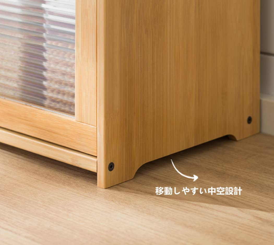 利点▶竹製なので、非常に強く、強い支持力があります。 お手入れが簡単で、お手入れの際は湿らせた布で拭くだけでキレイになれます。 ドアパネルは割れにくいアクリル素材を使用しており、耐荷重性に優れていて、 一般的な小型家電が置けます。