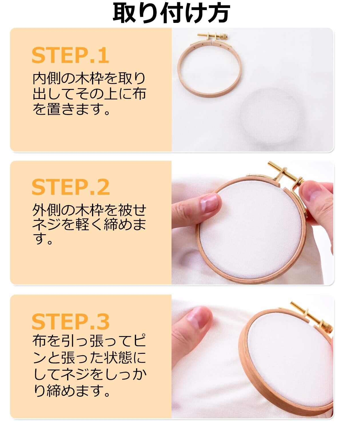 【ブナ材使用】ブナの木は、プラスチックや竹と比べ、ほどよくしなり、丈夫で割れにくく、生地も滑りにくいです。布をしっかり固定できます。また、使うほど手の油でなじむので、長く使うことで自分だけの使いやすい刺繍枠になっていきます。【銅メッキ金具】アンティーク調の金色の金具を使用。銅で表面加工することで、見た目にも美しく、サビ、腐食を抑えます。 【サイズ感】持ちやすく、布がたわまないサイズ感です。作業しやすく子供でも使いやすい。 【取り付け方】内側の木枠を取り出してその上に布を置き、外側の木枠を被せ、ネジを締める。布が緩まず張った状態になるよう気を付けてください。 【商品内容】刺繍枠セット 7.5cm2個セット、7.5cm/10.5cm2個セット、10.5cm2個セット、15.5cm2個セット、7.5cm/15.5cm2個セット、10.5cm/15.5cm2個セット、12.5cm2個セット、7.5cm/12.5cm2個セット【素材】ブナ材 ネジ部分:銅メッキスチール。 【国内販売元】5H5は、日本国内のお店です。 全ての商品を日本国内で一つ一つ丁寧に検品し、オリジナルパッケージに梱包しております。商標登録 第6597803号