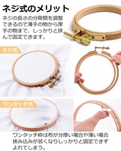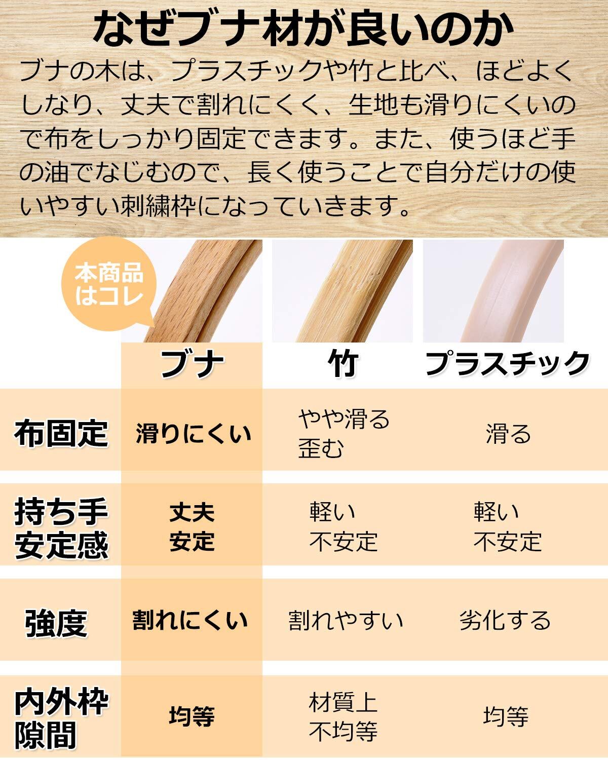 【ブナ材使用】ブナの木は、プラスチックや竹と比べ、ほどよくしなり、丈夫で割れにくく、生地も滑りにくいです。布をしっかり固定できます。また、使うほど手の油でなじむので、長く使うことで自分だけの使いやすい刺繍枠になっていきます。【銅メッキ金具】アンティーク調の金色の金具を使用。銅で表面加工することで、見た目にも美しく、サビ、腐食を抑えます。