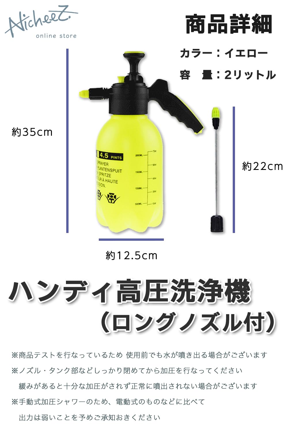 【商品内容】ハンディ高圧洗浄機 セット数:1個 カラー:イエロー 素材:ポリエチレン サイズ:縦/約35cm タンク直径/約12.5cm ノズル長さ/約22cm タンク容量/約2リットル ※ノズル・タンク部などしっかり閉めてから加圧を行なってください。緩みがあると、ノズル接続部からの漏れの原因や十分な加圧がされず正常に噴出されない場合がございます。また、必要以上の加圧は容器破損・水漏れの原因となります。手動式加圧シャワーのため、電動式のものなどに比べて出力は弱いことを予めご承知おきください。商品テストを行なっているため 使用前でも水が噴き出る場合がございます。