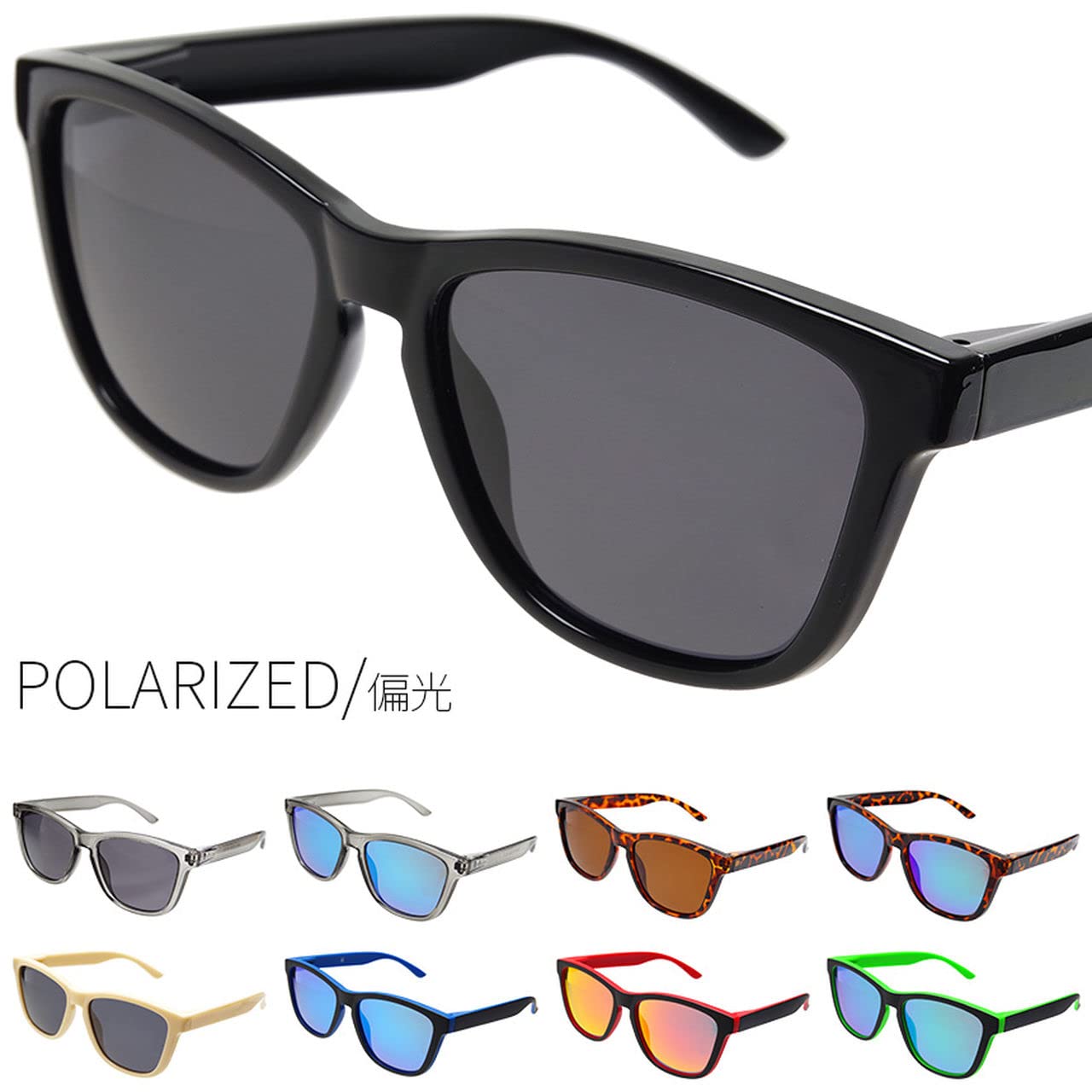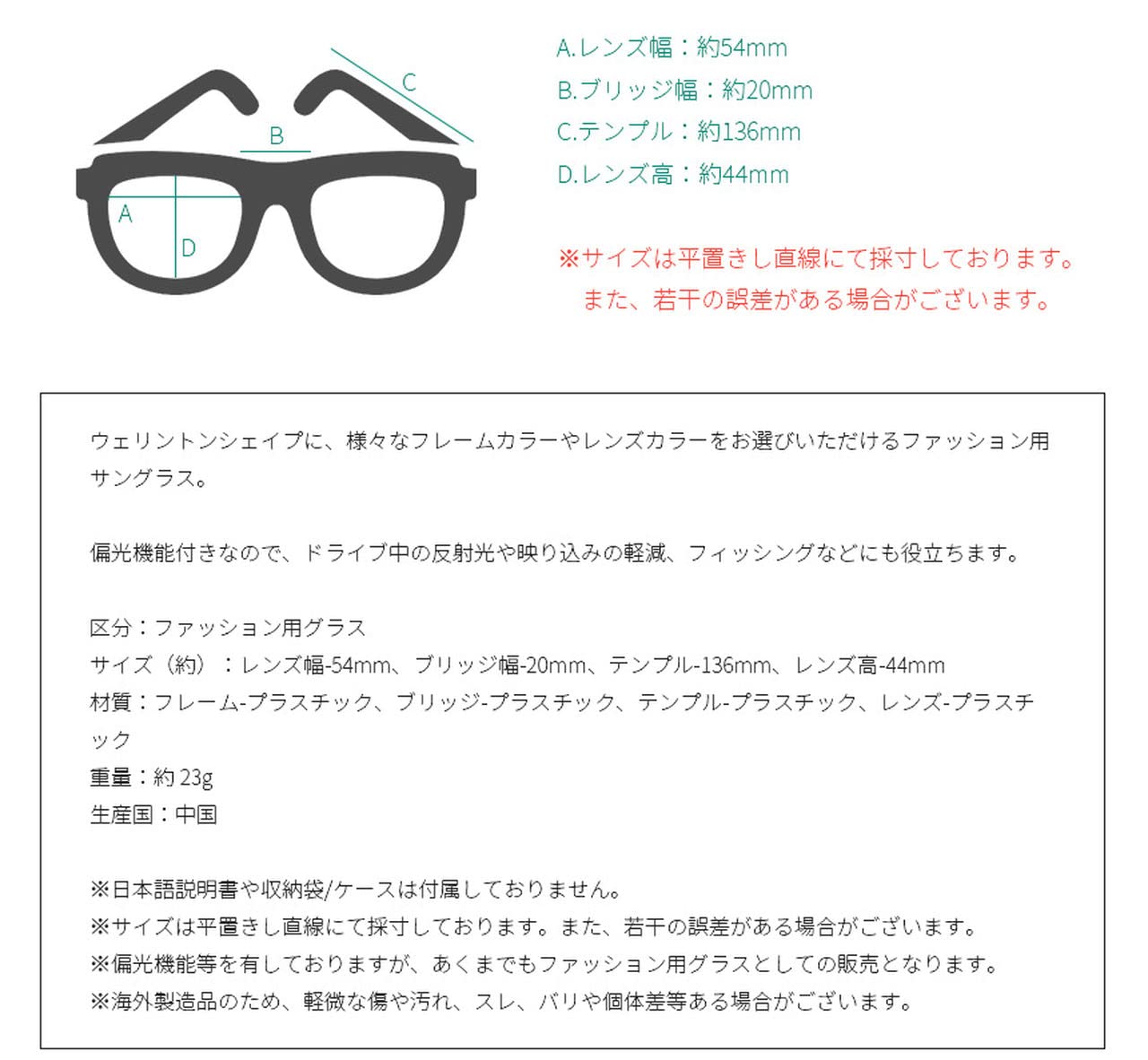 ウェリントンシェイプに、様々なフレームカラーやレンズカラーをお選びいただけるファッション用サングラス。<br> <br> 偏光機能付きなので、ドライブ中の反射光や映り込みの軽減、フィッシングなどにも役立ちます。<br> <br> 区分:ファッション用グラス<br> サイズ(約):レンズ幅-54mm、ブリッジ幅-20mm、テンプル-136mm、レンズ高-44mm<br> 材質:フレーム-プラスチック、ブリッジ-プラスチック、テンプル-プラスチック、レンズ-プラスチック<br> 重量:約 23g<br> 生産国:中国<br> <br> ※日本語説明書や収納袋/ケースは付属しておりません。<br> ※サイズは平置きし直線にて採寸しております。また、若干の誤差がある場合がございます。<br> ※当商品は偏光機能等を有しておりますが、あくまでもファッション用グラスとしての販売となります。<br> ※海外製造品のため、軽微な傷や汚れ、スレ、バリや個体差等ある場合がございます。<br>