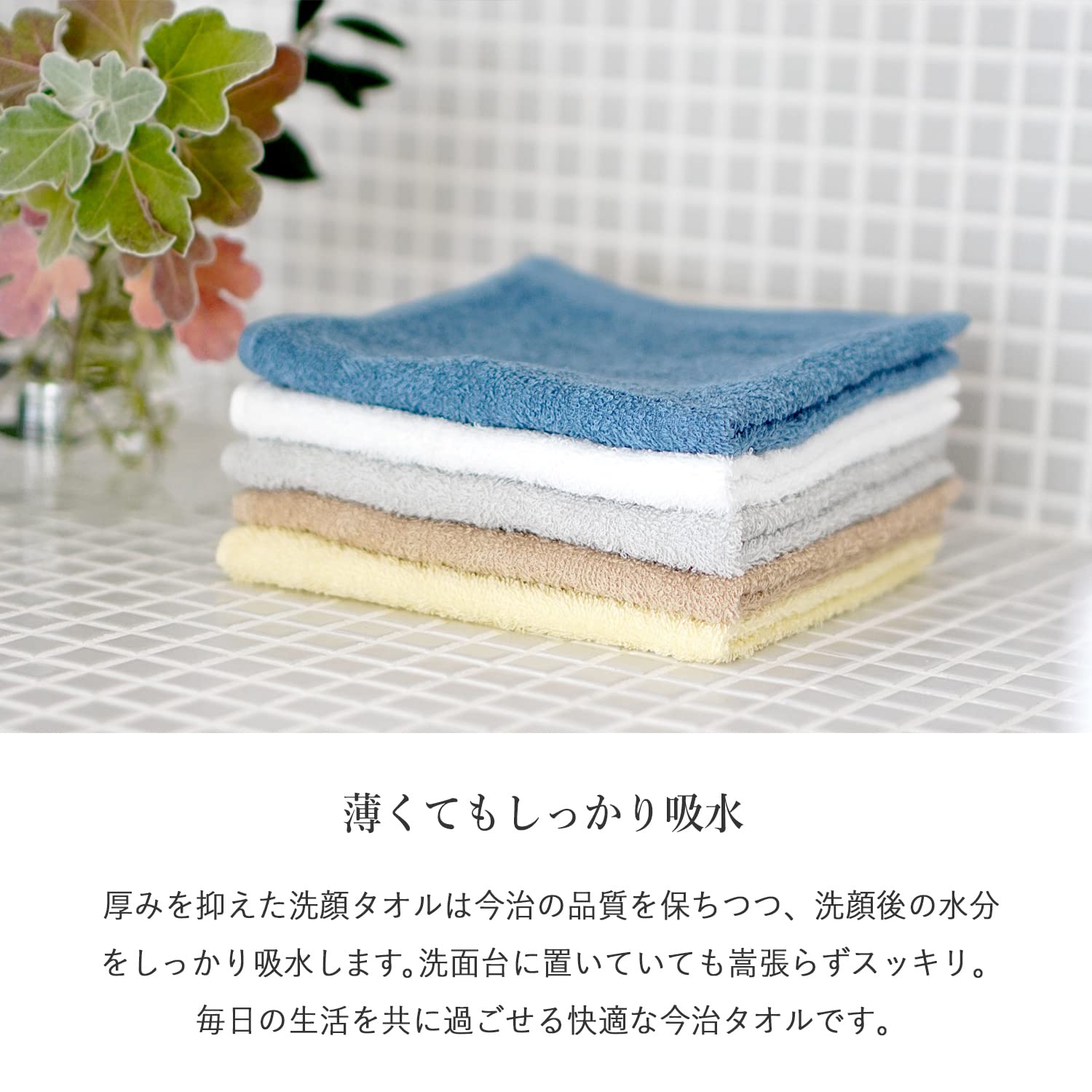 【薄くてもしっかり吸水】 厚みを抑えた洗顔タオルは今治の品質を保ちつつ、洗顔後の水分をしっかり吸水します。 洗面台に置いていても嵩張らずスッキリ。毎日の生活を共に過ごせる快適な今治タオルです。