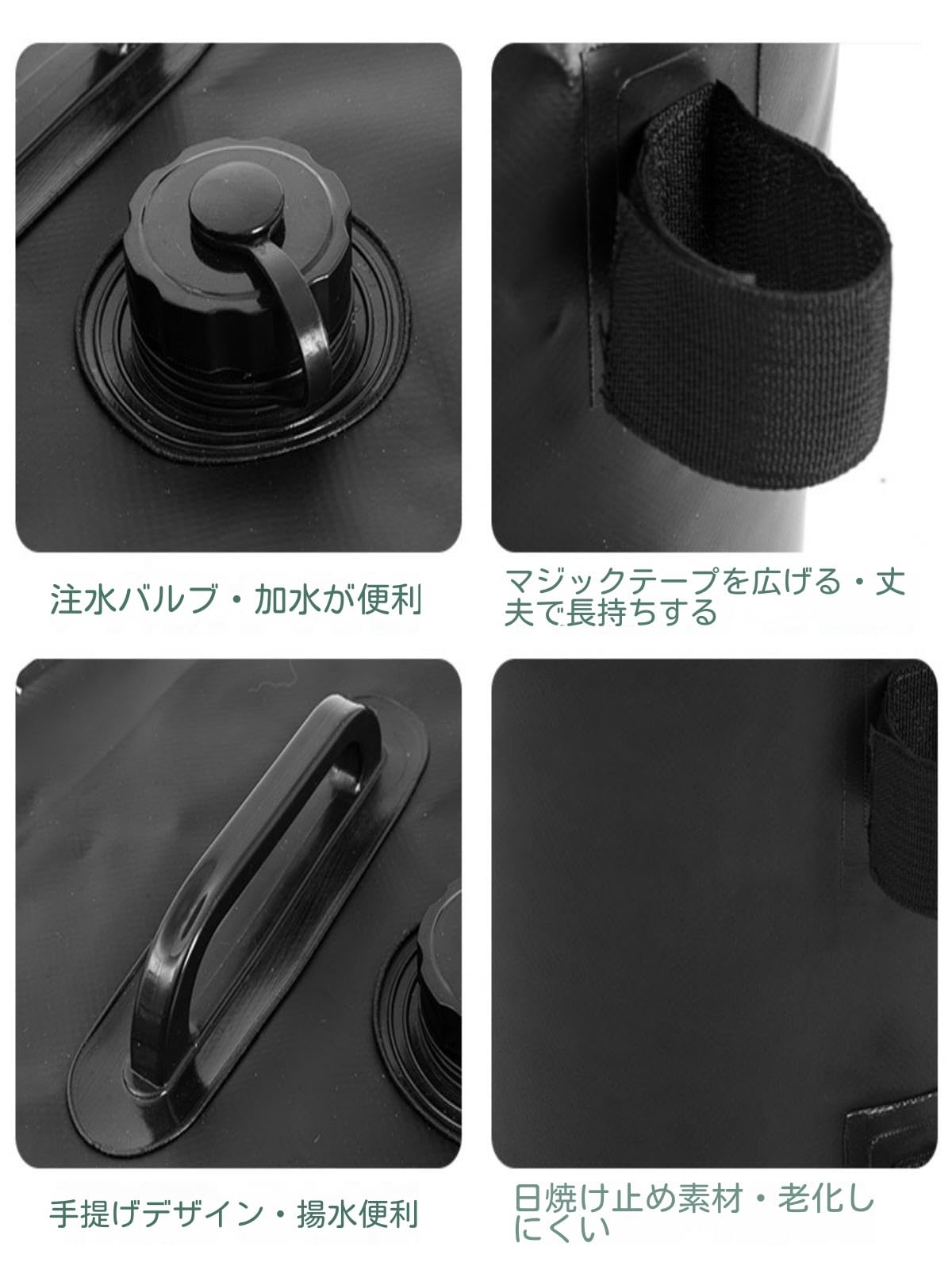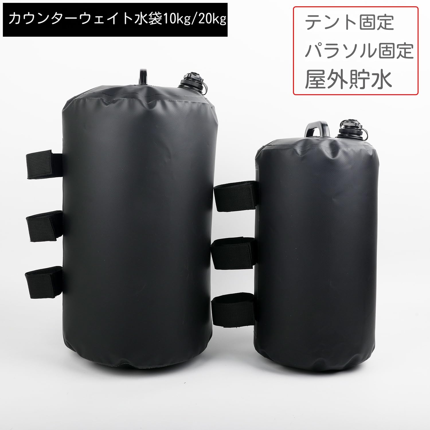 1つあたり10Lもしくは20Lなので重りとしての機能は十分で、折りたたみ式で取っ手もついているので持ち運びにも優れています。・アスファルトや砂地など、ペグが打てない場所でも使えるのでアウトドア用としてはもちろん、アイデア次第で色々な用途としてお使いいただけます。・【バリエーション】容量10L(2個セットor4個セット) / 容量20L(2個セットor4個セット) ・【仕様】サイズ : (10L) 直径20cm×高さ30cm / (20L) 直径25cm×高さ40cm / 材質 500Dポリエステル / 適合ポールサイズ : (約)φ15mm~φ55mm