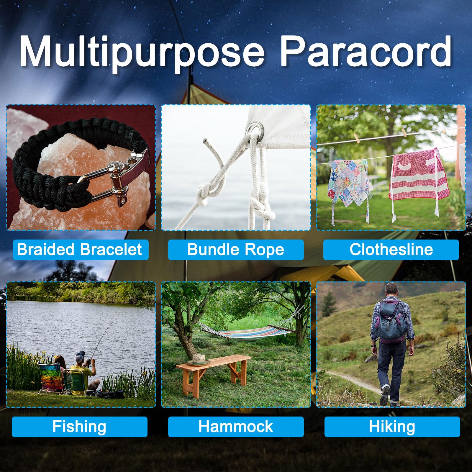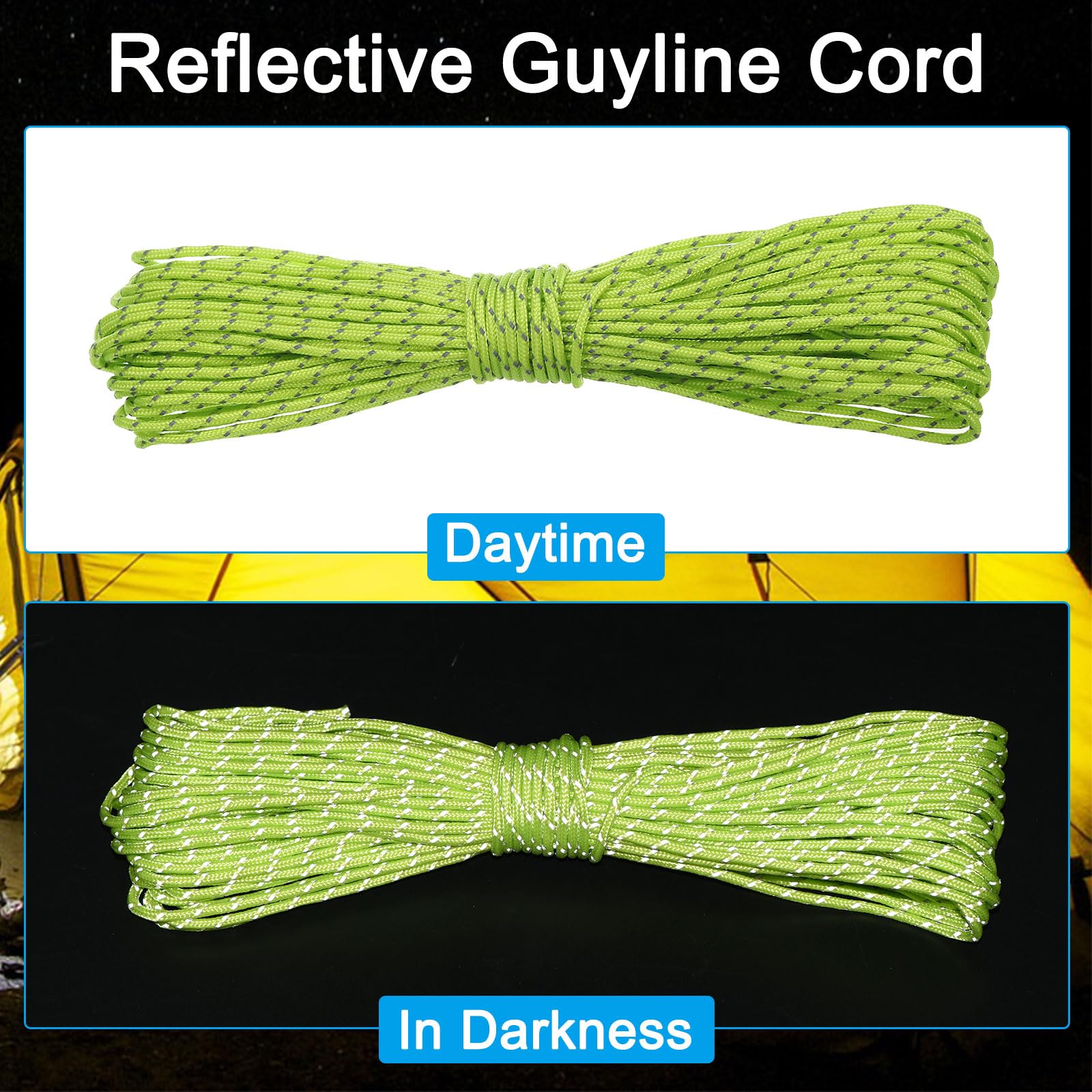 用途:反射ガイラインコードは、テント、タープ、レインフライ、オーニングなどの設置に最適で、キャンプ、ハイキング、狩猟、シューティングゲーム、コンサート、夜間ランニングなどのアウトドア活動に適しています。軽くて薄いロープは、ブレスレット、ネックレス、キーチェーンなどのDIY手芸にも使用できます。