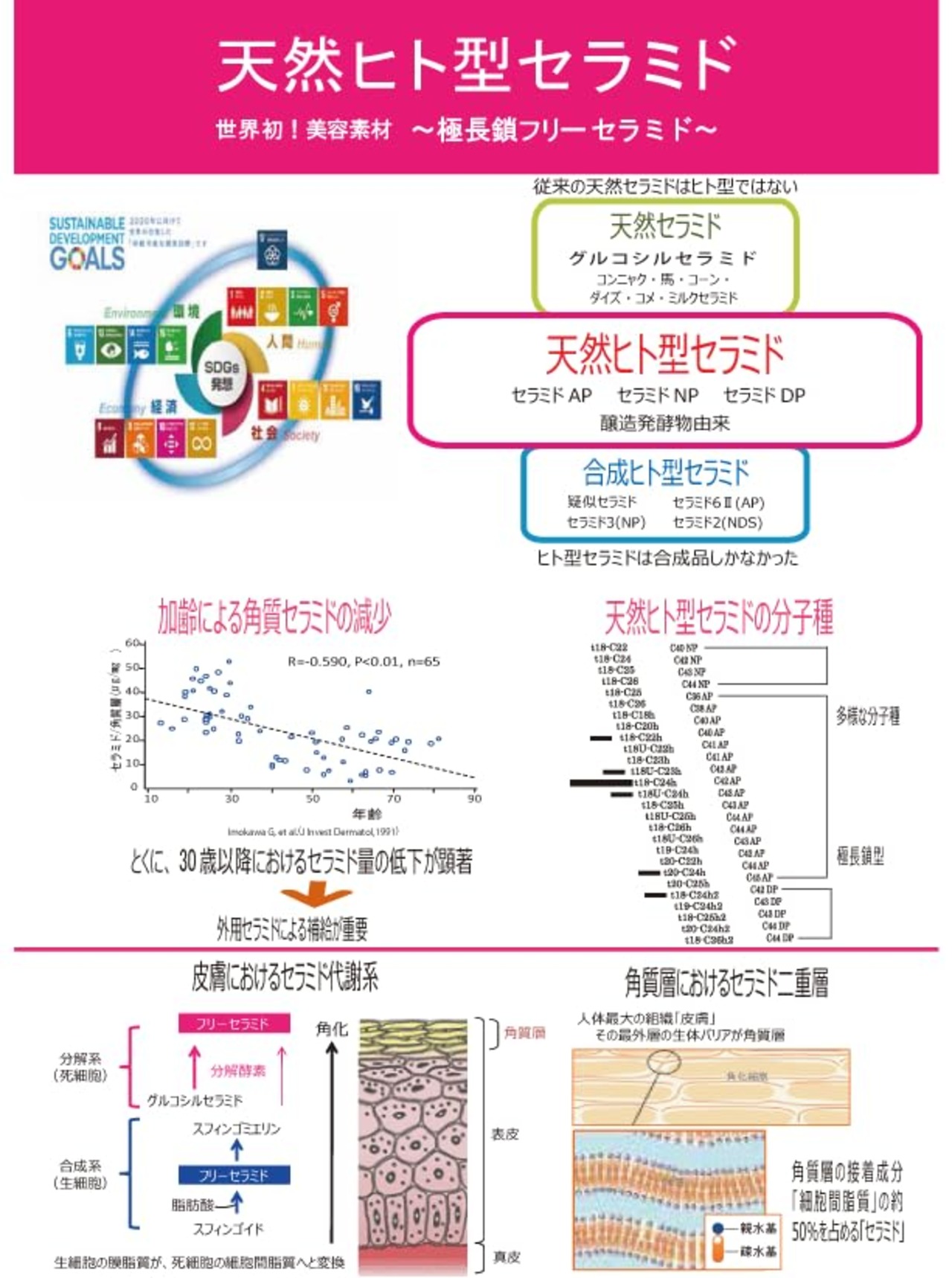 「Cera-Tab(セラタブ)」に配合されている天然ヒト型セラミドは世界初の天然醸造発酵物から高純度精製したセラミドです。(特許第5013348号) ■天然ヒト型セラミドは、醸造発酵物から精製されているため、ヒトの肌に本来存在するセラミドと同じ構造を持ちます。 そのため、細胞間脂質にぴったりと馴染んで、効果的に機能します。 また、天然ヒト型セラミドには長い分子種と短い分子種のセラミドが多く含まれています。 ■天然ヒト型セラミドが配合している製品は、肌のバリア強化や保湿、ツヤを求める方、エイジングケア重視者、環境に配慮した製品を希望する方、美容サロンの効果を自宅で得たい方におすすめです。