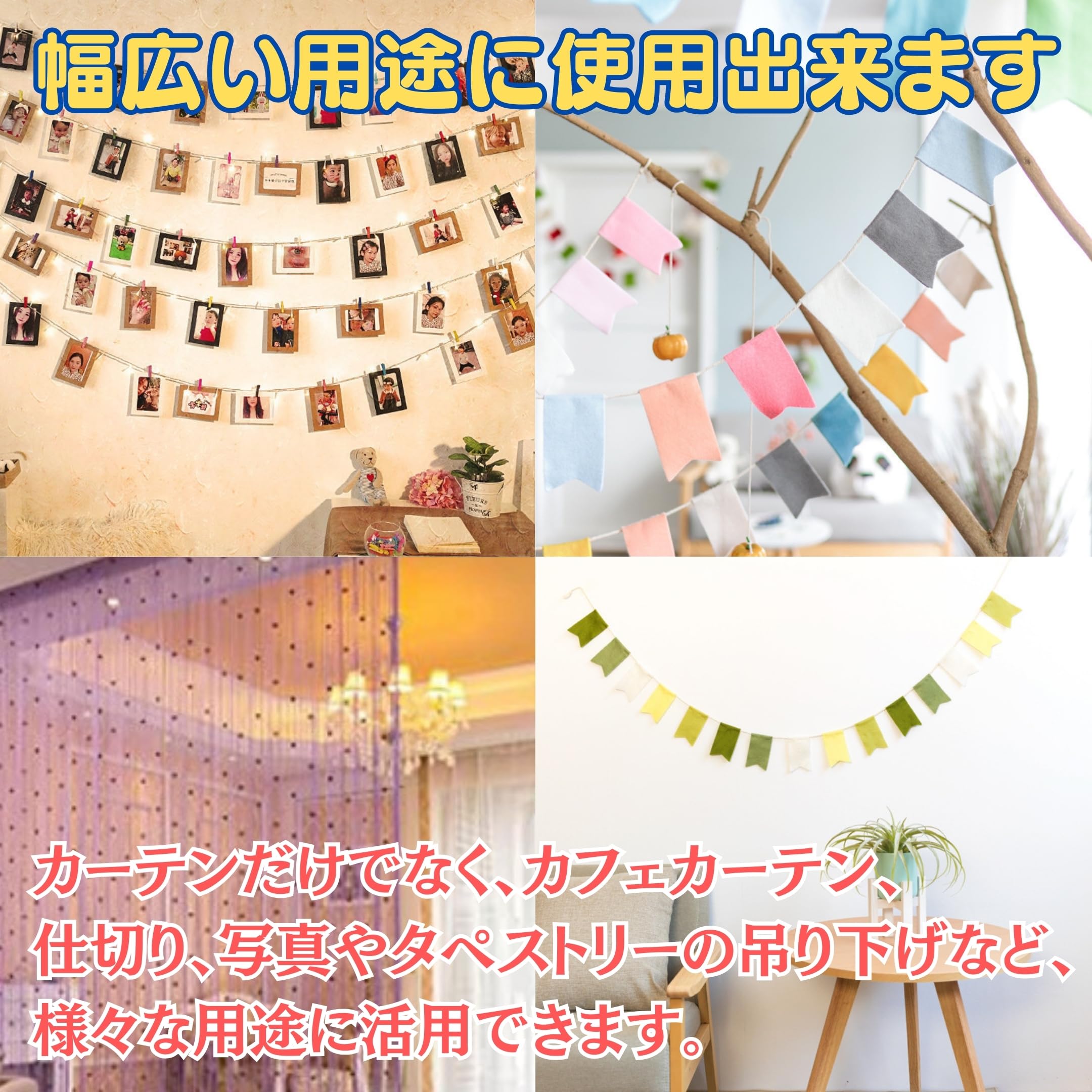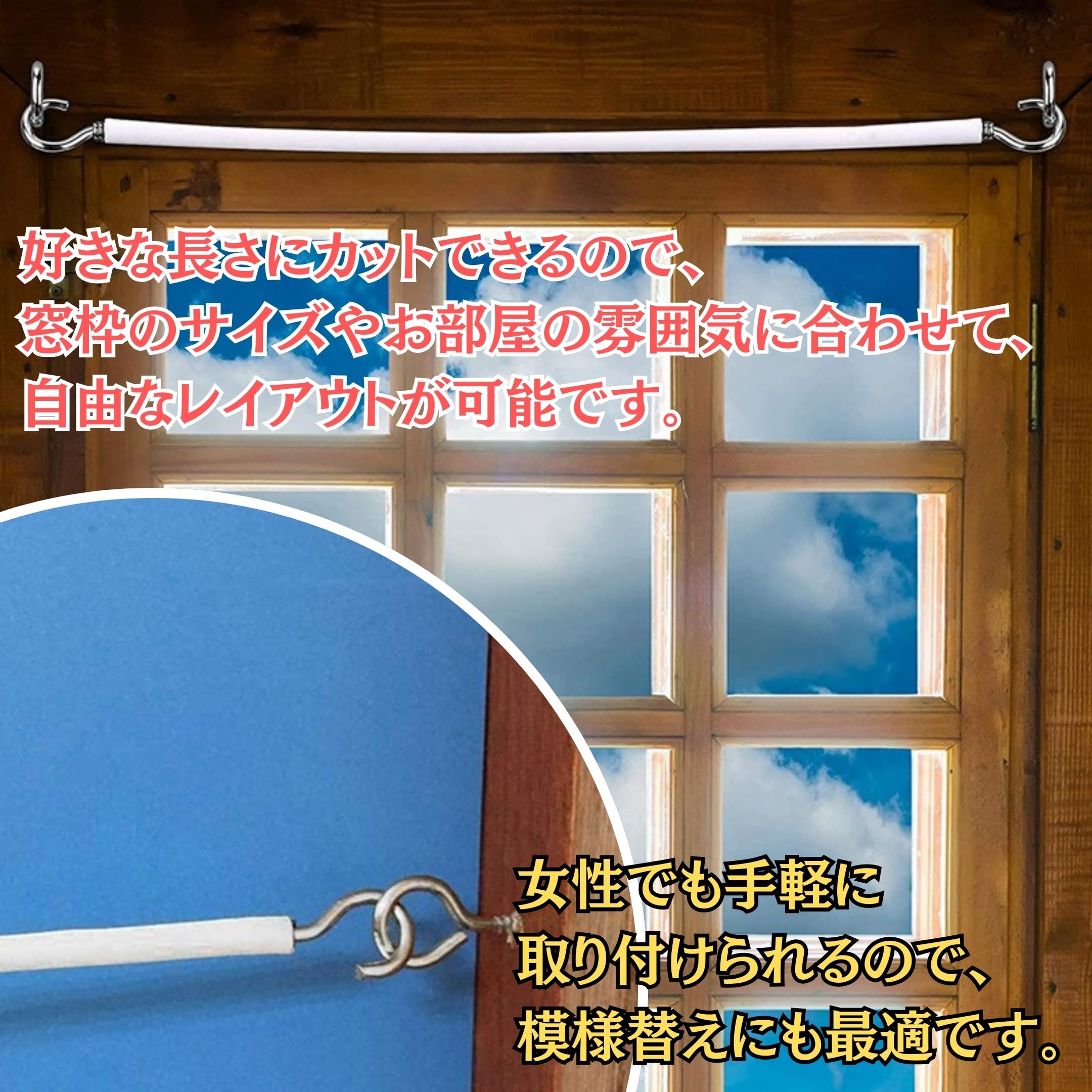 ✅「3つの長さからお選び可能」2m、5m、10mの3つの長さから、ご希望に合わせてお選びください。必要な長さにカットできるので、窓枠にぴったりフィットさせることができます。 ・2m:小窓や間仕切りに最適 ・5m:一般的な窓サイズに対応 ・10m:大きな窓や複数窓をまとめて吊るしたい場合に