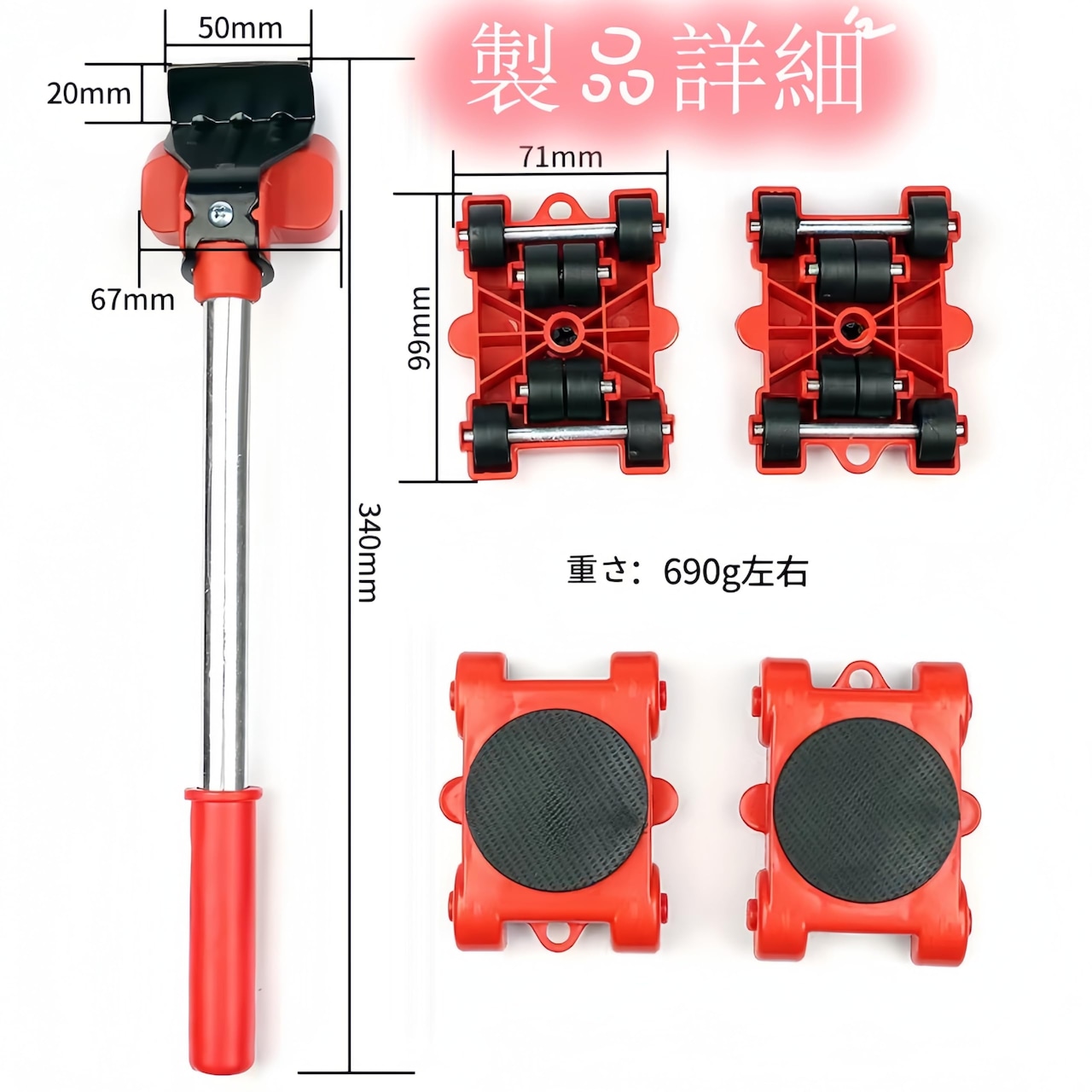 セット内容】リフター×1点 台車×4点 【サイズ(約)】リフター:34cm 台車:9.9cm×7.1cm 【カラー】レッド・グレー ※お好きなカラーをお選びいただけます。【耐荷重(約)】400㎏