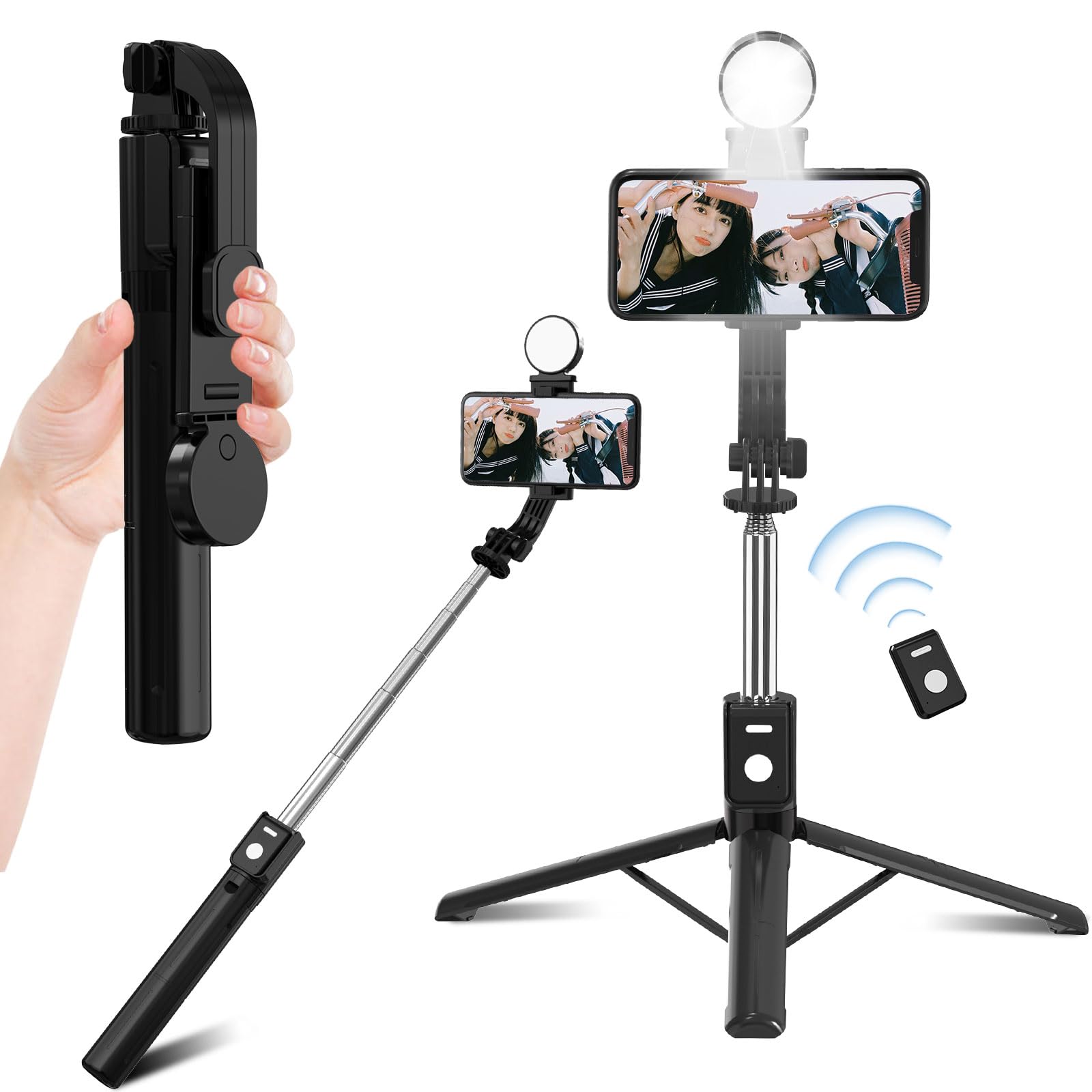 自撮り棒 スマホ 三脚 【2024安定モデル】 自 撮り 棒 ライト付き 7段階伸縮 4段階調光 bluetoothリモコン じどり棒 アンドロイド 長い コンパクト 軽量 自撮り/セルカ棒/撮影録画/生放送 日本語説明書付き ブラック