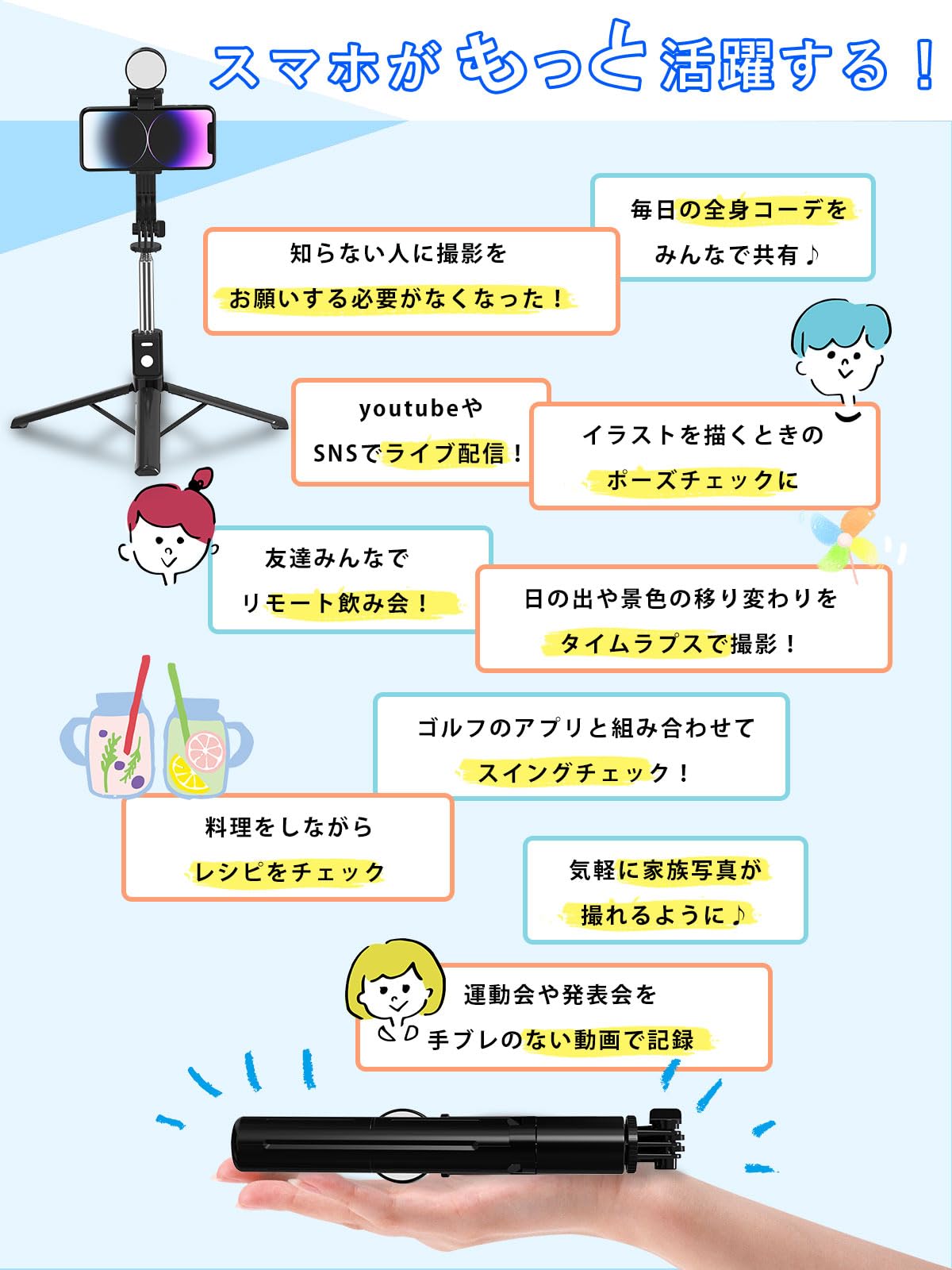 ♥【2024新登場・超軽量!コンパクトで多機能!!】三脚・一脚兼用、ライト付き、自由回転、bluetoothリモコン操作など多彩な機能を搭載しているスマホ用のじどり棒です。携帯または収納する際は、折りたたんでコンパクトな形状にすることが可能。さらに、自撮り棒にライトが付いたものは、夜景など暗い場所や室内での自撮りに活躍します。コンパクトなうえに高品質プラスチックを使用し軽量で丈夫な仕上がりに、収納時に最短わずか24㎝、重さは212g。