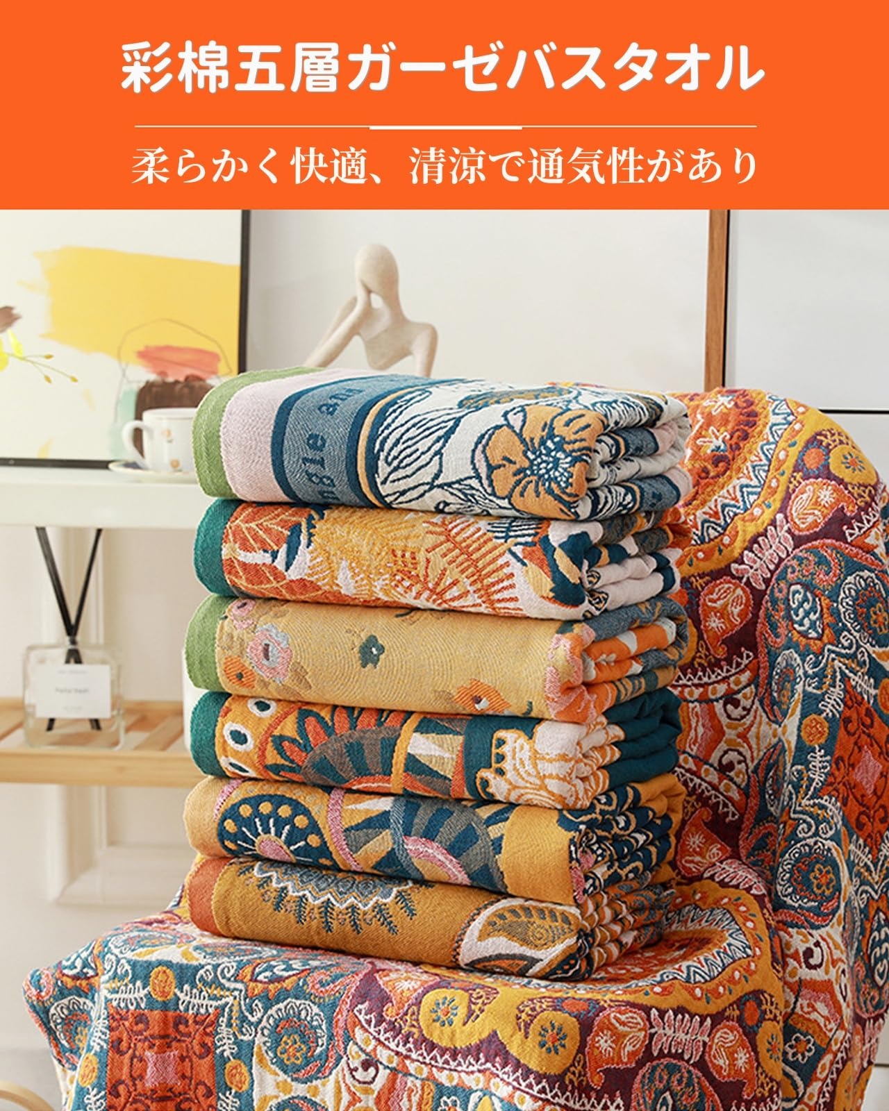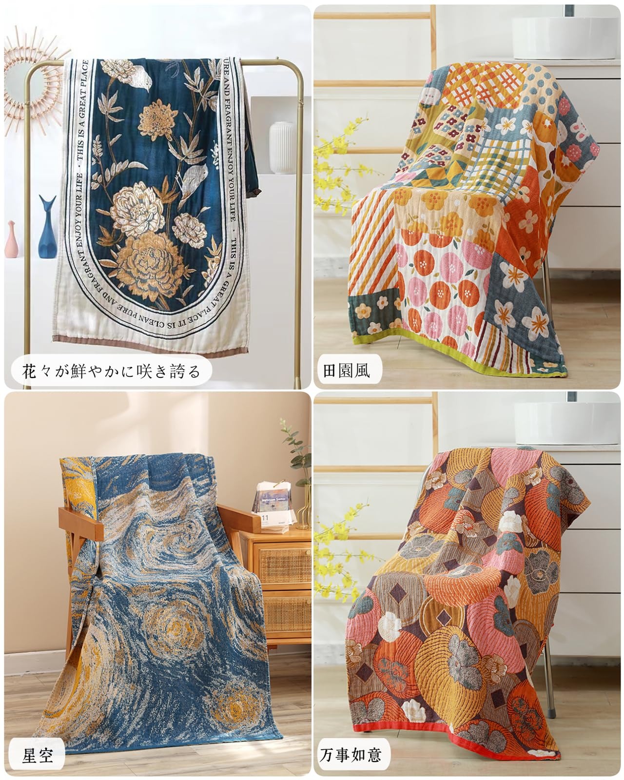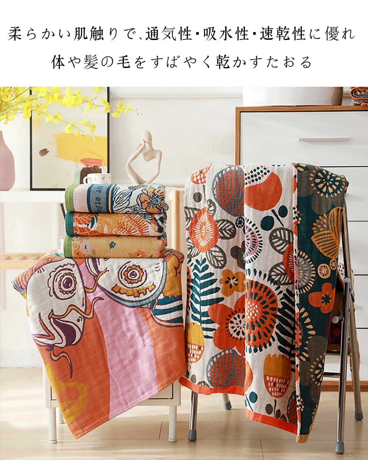 【超実用性&贈り物に最適】ガーゼ バスタオルは、家庭用、温泉、旅行、プールなど様々な場面で使えるだけでなく、ソファー、オフィス、ベッド、車内での使用にも適しています。多様な色とパターンのデザインがあり、同僚、上司、顧客への理想的なプレゼントとなりますし、祝い事や祭りのギフトとしても最適です。