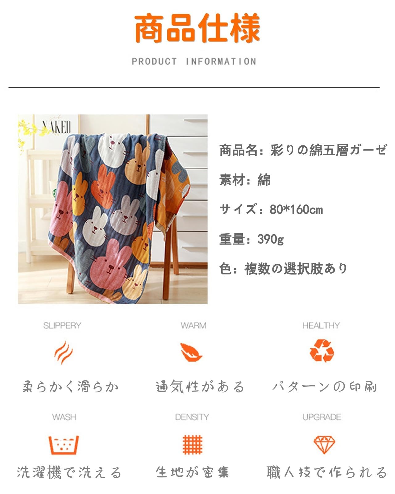 【商品仕様】商品名:彩棉五層ガーゼバスタオル。素材:綿ガーゼ。サイズ:80*160cm。洗濯方法:手洗い及び洗濯機使用可。特徴:吸水性・速乾性・通気性があり、厚手で軽量、毛羽落ちしにくく、毛玉になりにくい、蛍光剤不使用。