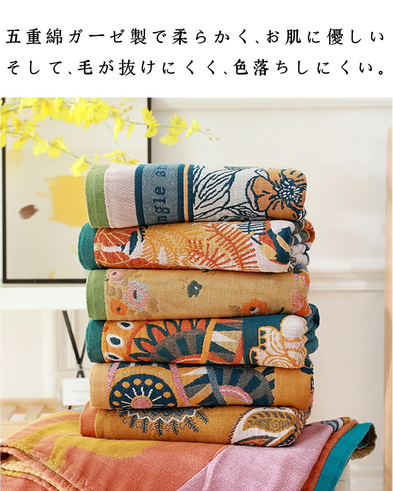 【高品質棉ガーゼ素材】バス タオルは、安全な無蛍光剤の五層綿ガーゼ素材を使用しており、肌に優しく、ふんわりと柔らかい質感で快適な触り心地です。敏感肌の方やお子様も安心して使用できます。バスタイム後の体拭きや、あかちゃんのおくるみとしてもお使いいただけます。