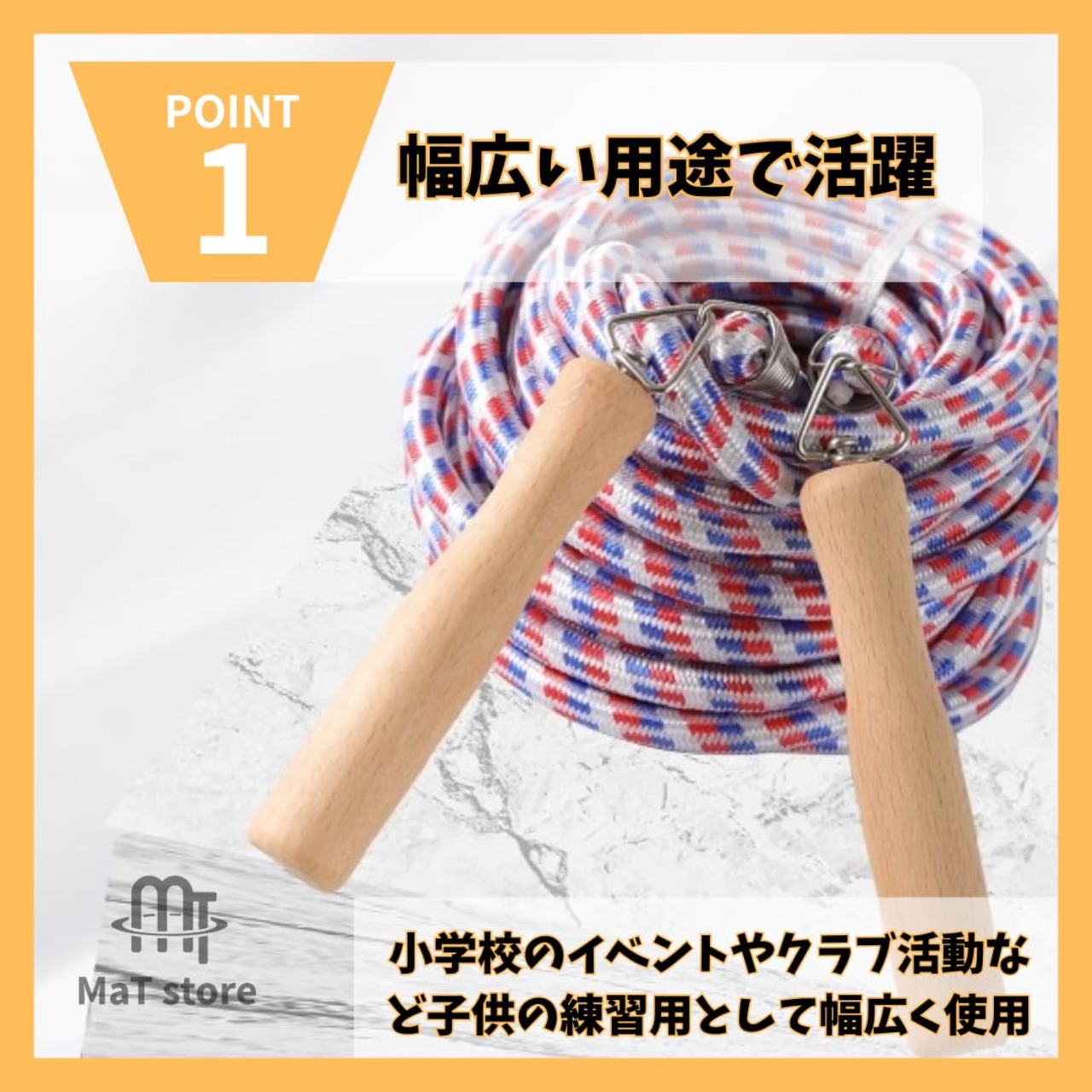 【幅広い用途】小学校のイベントやクラブ活動など子供の練習用として幅広く使用されています。また最近では家庭のお庭で遊ぶこともあり家庭のコミュニケーションの一環として用いられることもあります。 【木製グリップ】手で持つグリップは木製となっており持ち心地が良く痛くなりづらい作りとなっています。また持ち手と縄が360°回転するので非常に回しやすくなっています。 【使用人数】大繩跳びの使用人数は5mは3-4人、7mは5-7人、10mは8-10人となります。目安人数となりますが体格などにより使用人数は変わることもありますのであくまでも目安としてご参考にしてください。