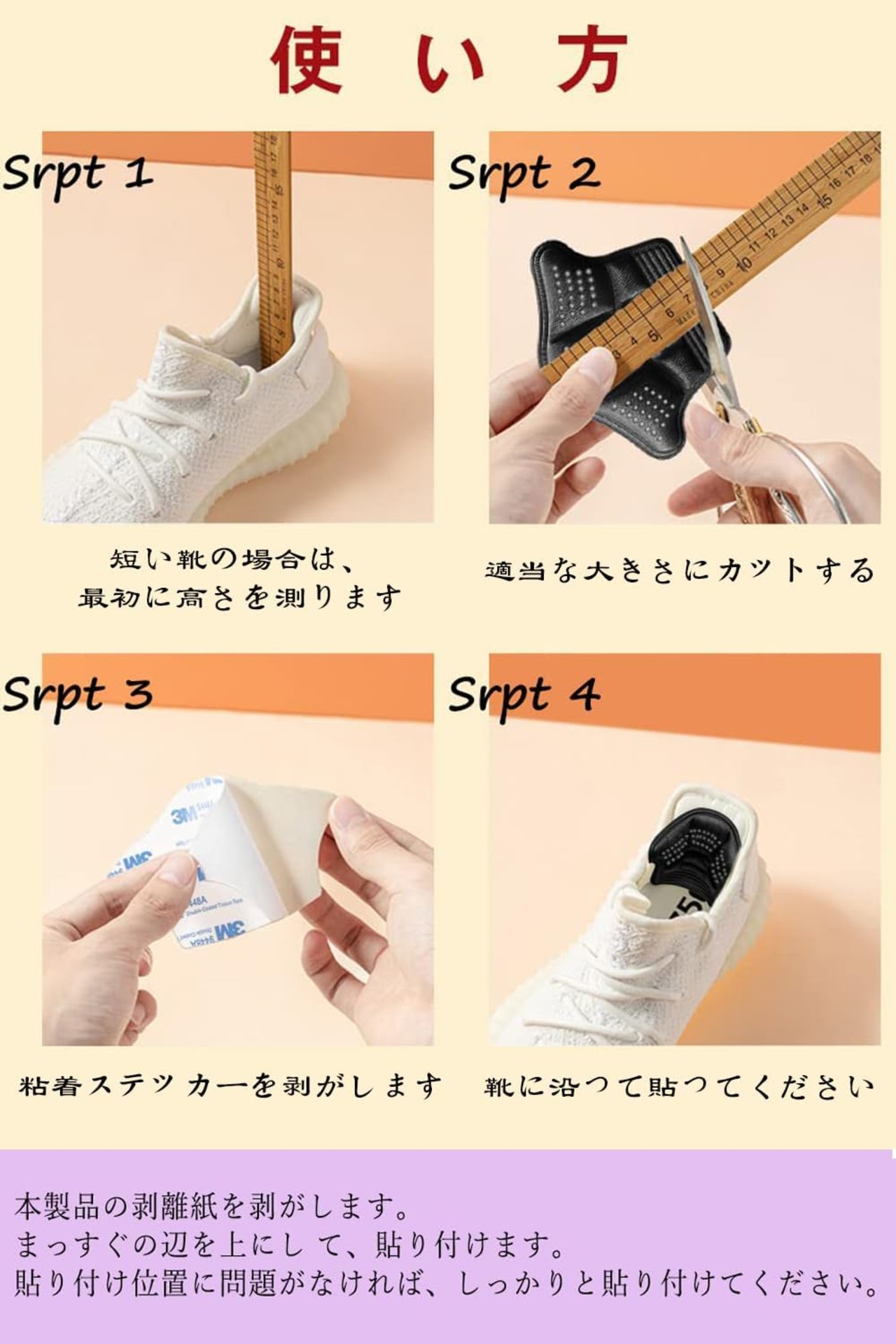 【カット自由】靴に合わせて裁断線に沿って自由にカットでき、様々な靴に使用できます。靴擦れ防止テープの裏面には粘着性の強いシールが付いていて、台紙をはがしてきれいに磨いた靴に貼るだけで簡単に取り付けられます。粘着性が強く、かかと部分につけると、ずり落ちる心配がありません。使い方は簡単で、初心者でも簡単に使えます。