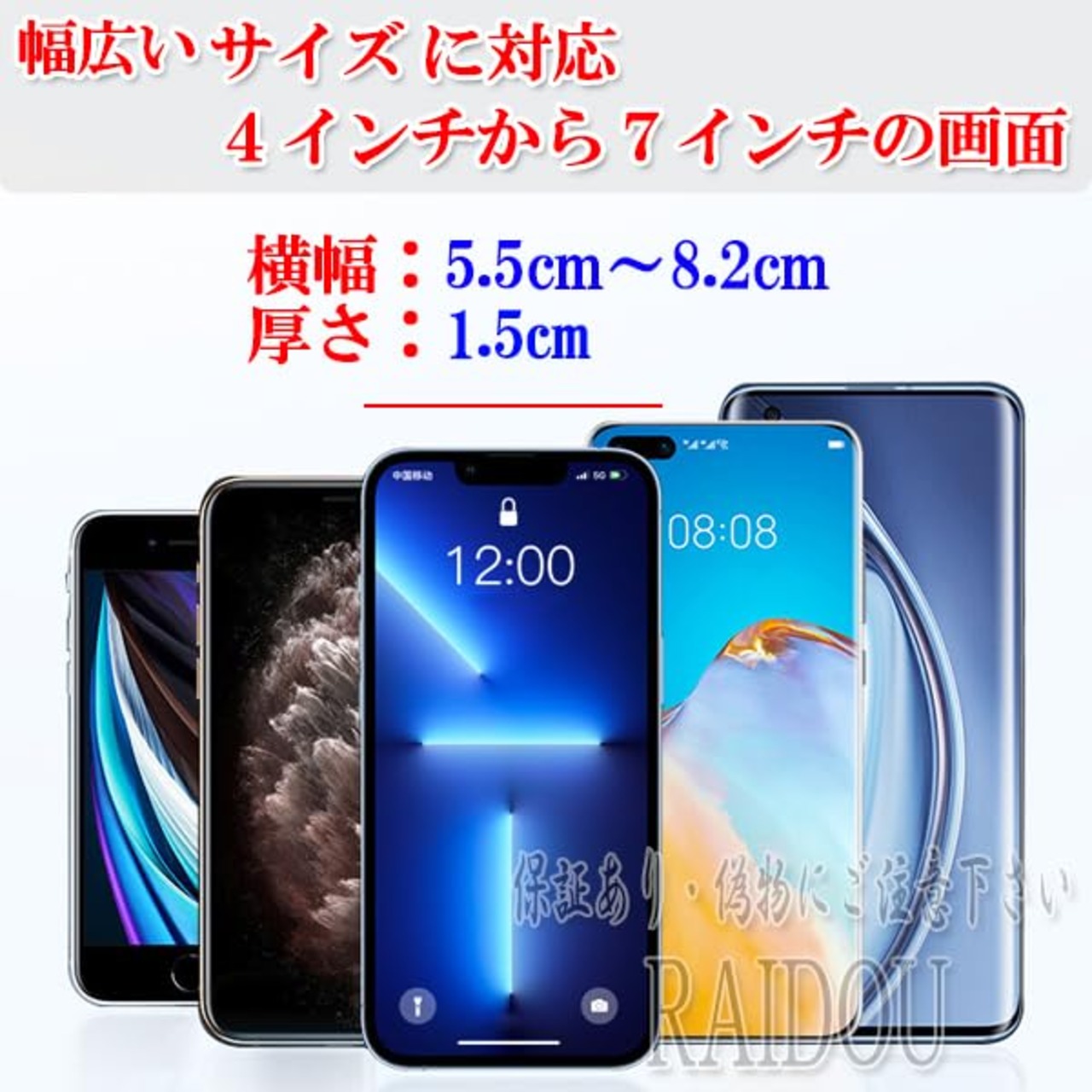 【商品内容】 ・ホルダー本体×1 ・固定金具×1 ・素材…ABS 【スマホ・適合サイズ】 横幅:5.5cm-8.2cm 厚さ:1.5cmまで ※取扱説明書は付属しておりません ※必ず取付場所のご確認ください。 ※過度な荷重は外れる可能性がございますので、使用用途はスマートフォンのみ取付をお願い致します。