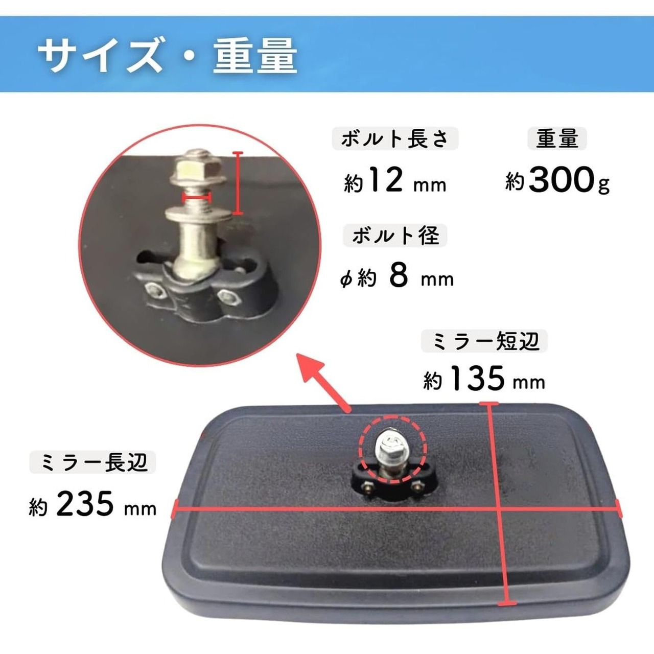 【サイズ】約235mm×約135mm、ボルト径:約φ8mm、ボルト長さ:約12mm、【重量】約300g/個、【バリエーション】1個(単品)、左右2個セット、左右2個セット×2(合計4個)の3種類よりお選びいただけます。
